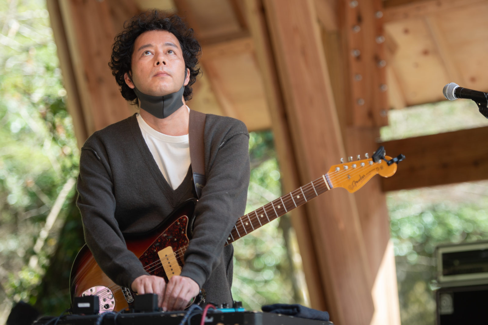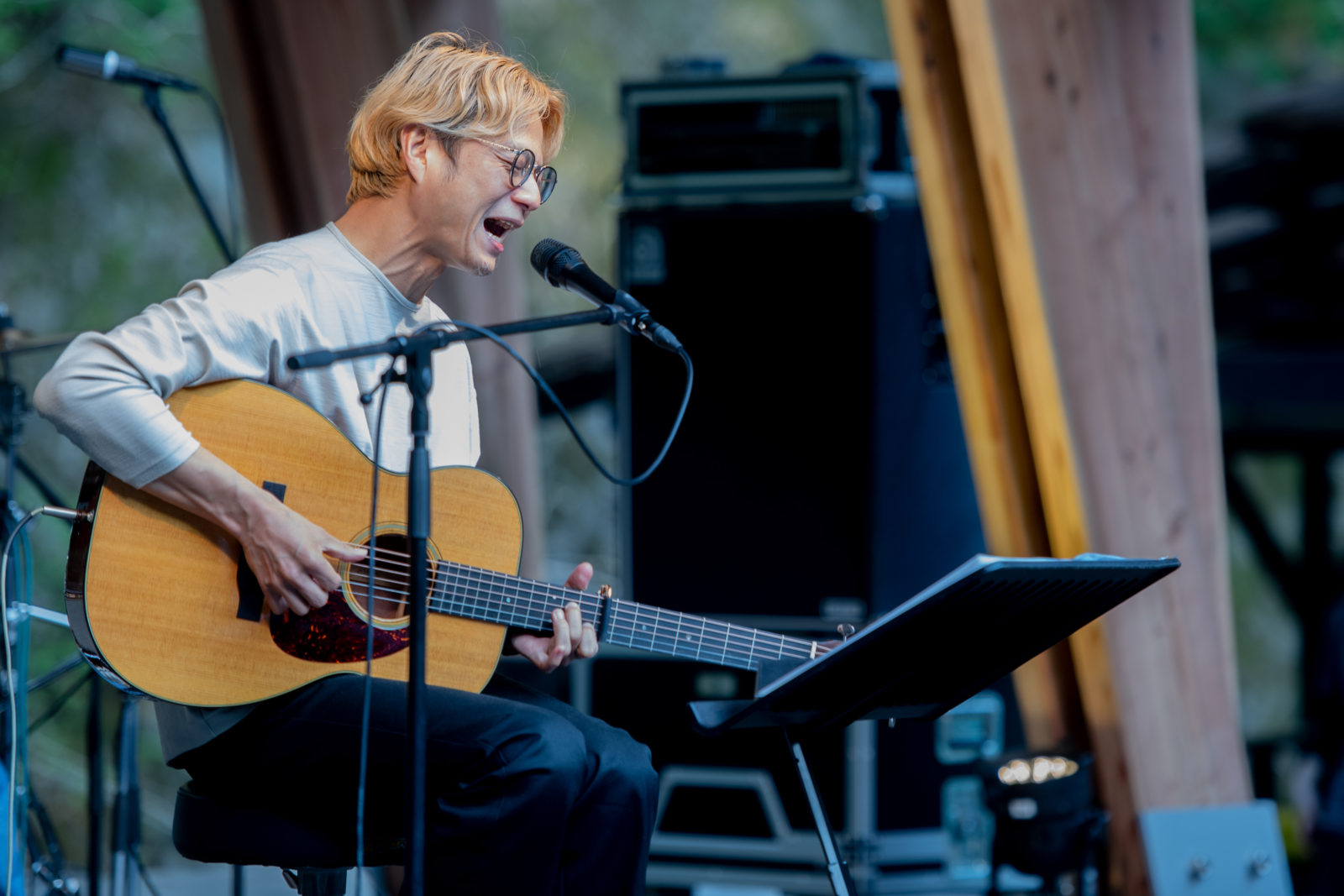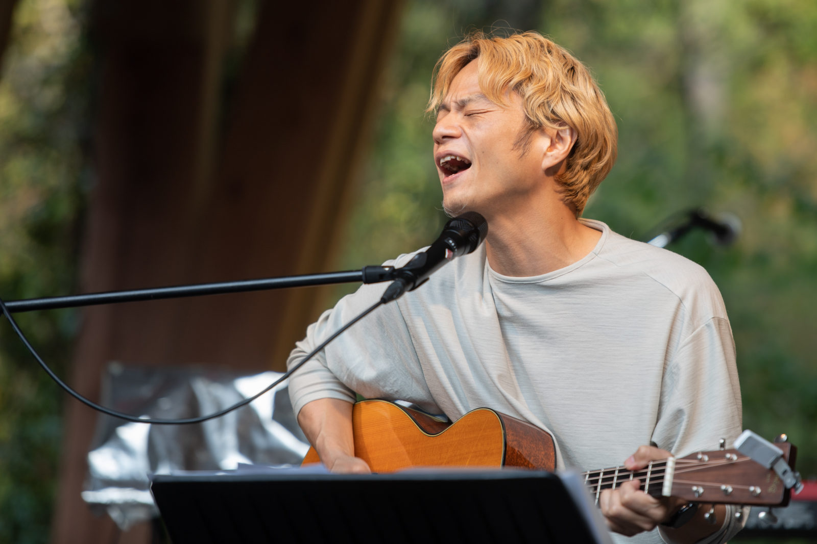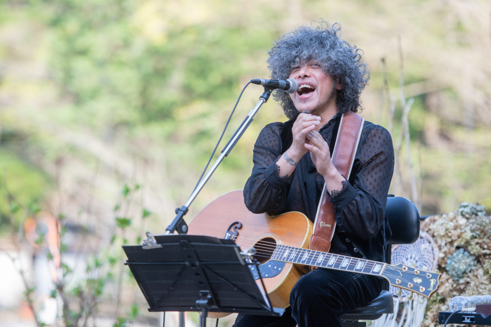 奇妙礼太郎のサウンドチェックが始まり歌声が響き始めると、ほのかに歓声が上がり始める会場内。ギターをつま弾きながら鳥が囀るような声が、オーディエンスの身体と身体の隙間をすり抜け、あきる野の自然の中へと消えていきます。