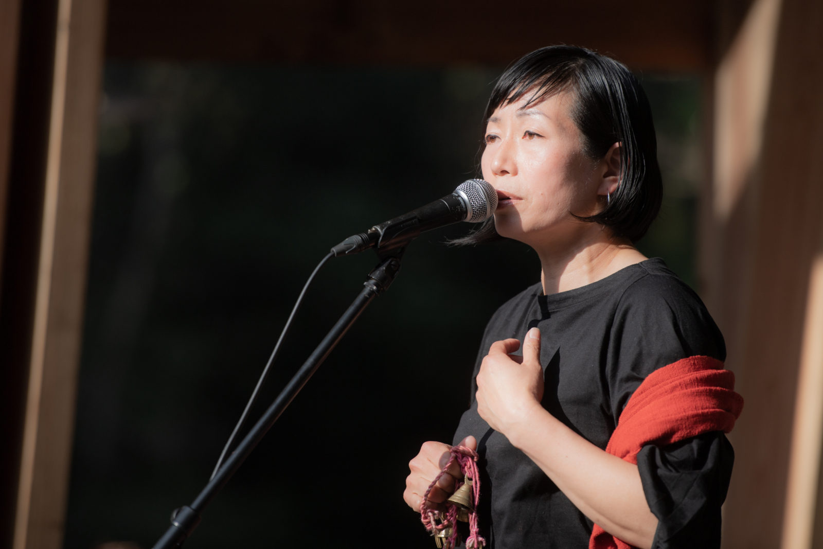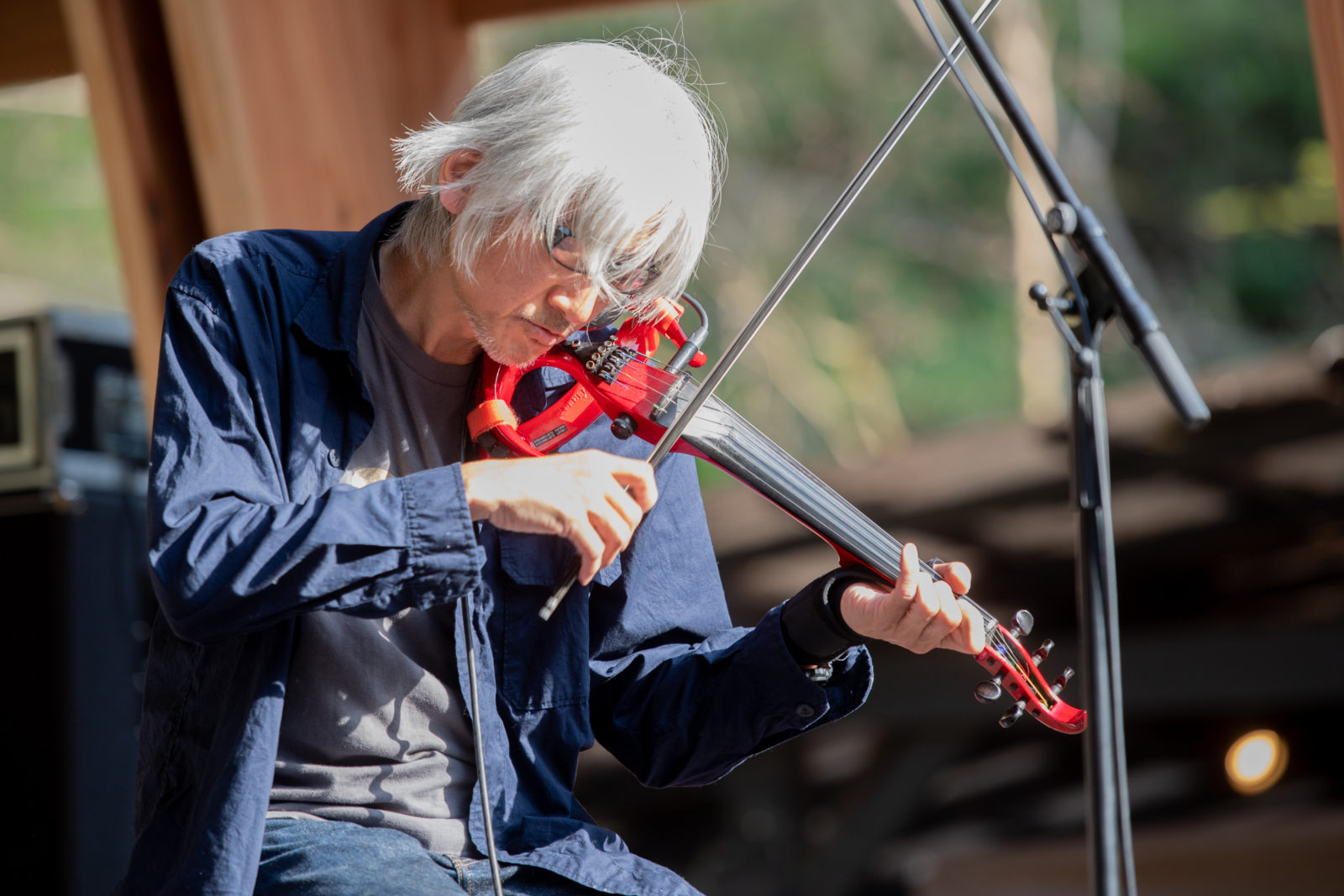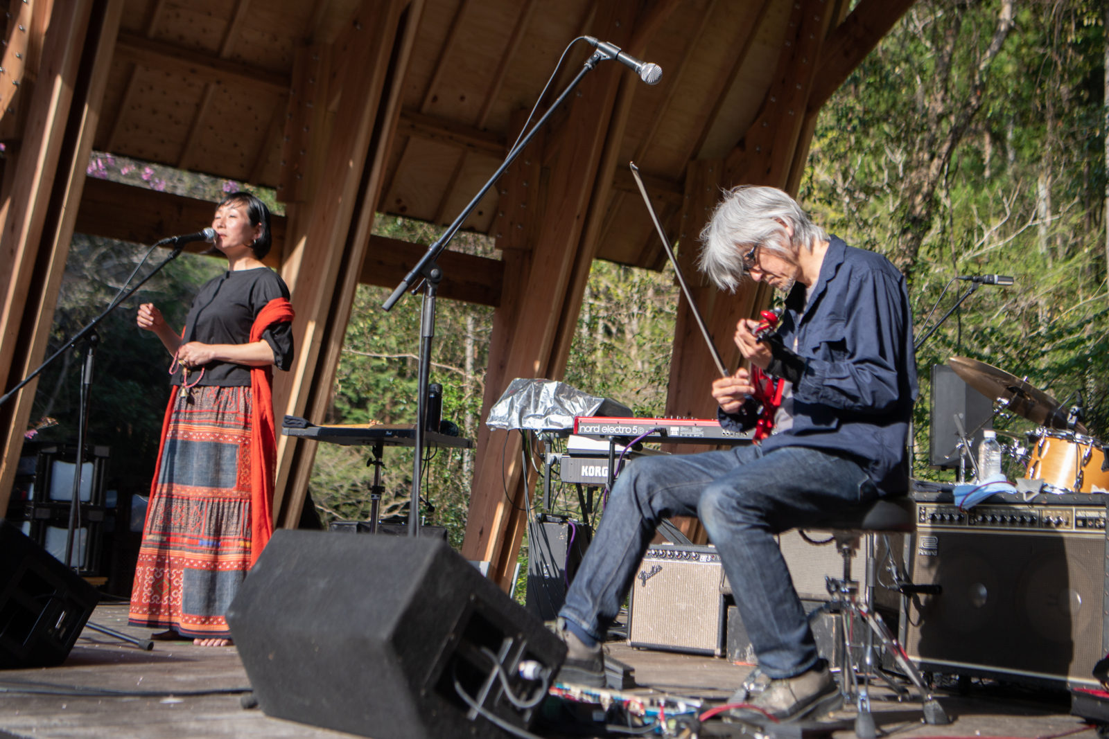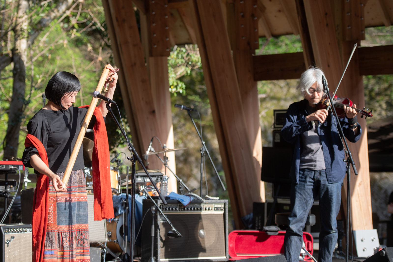 夕暮れに差し掛かろうとしている会場内。少し涼しく過ごしやすい気候となった時間帯に、勝井祐二とYaeがステージに登場します。勝井祐二のバイオリンとYaeの歌声の掛け合いは、二人だけの共通言語のようにその応酬をこだまさせます。