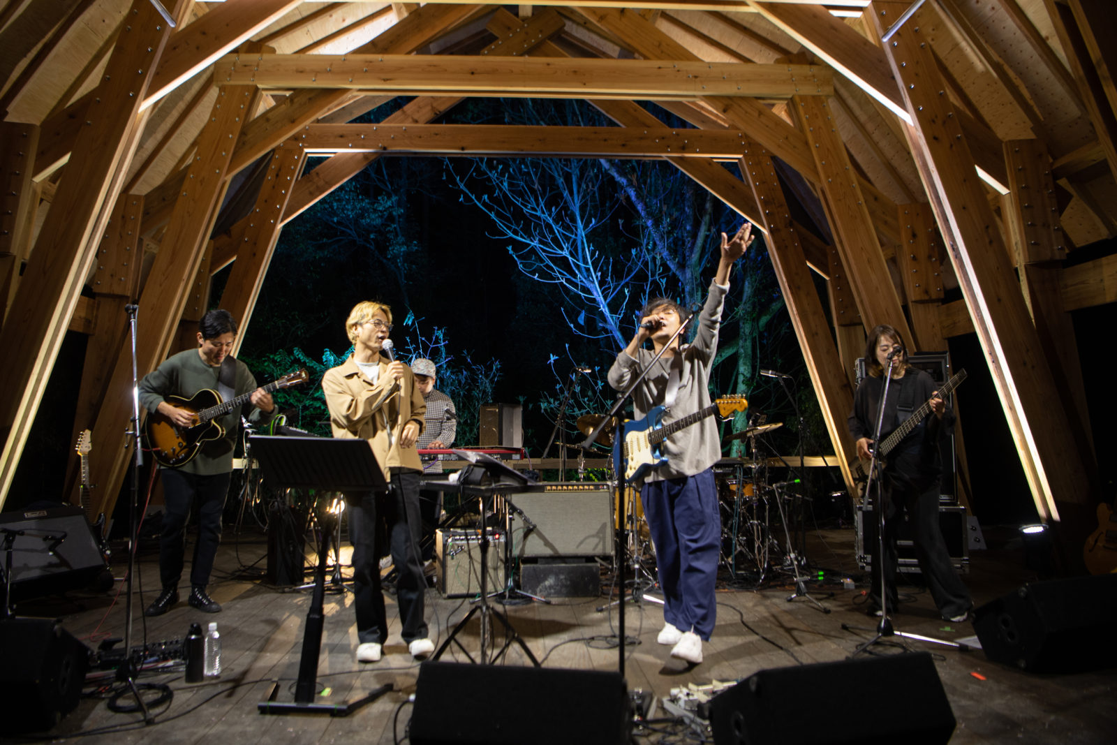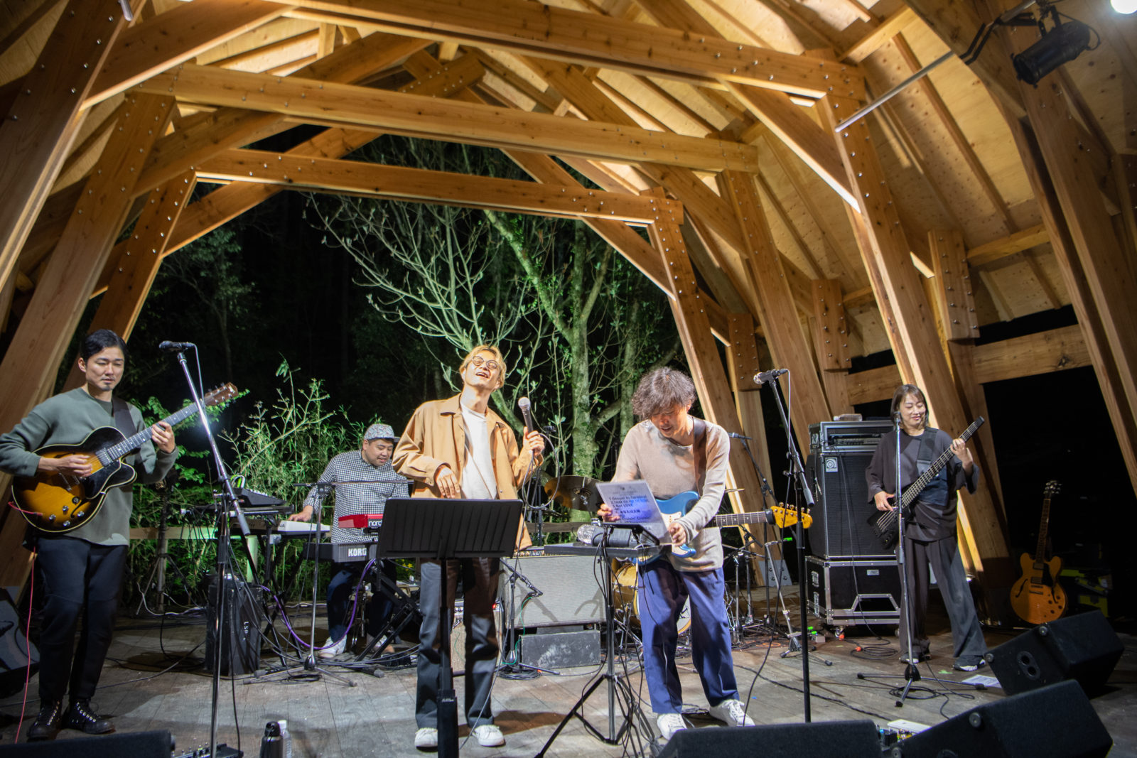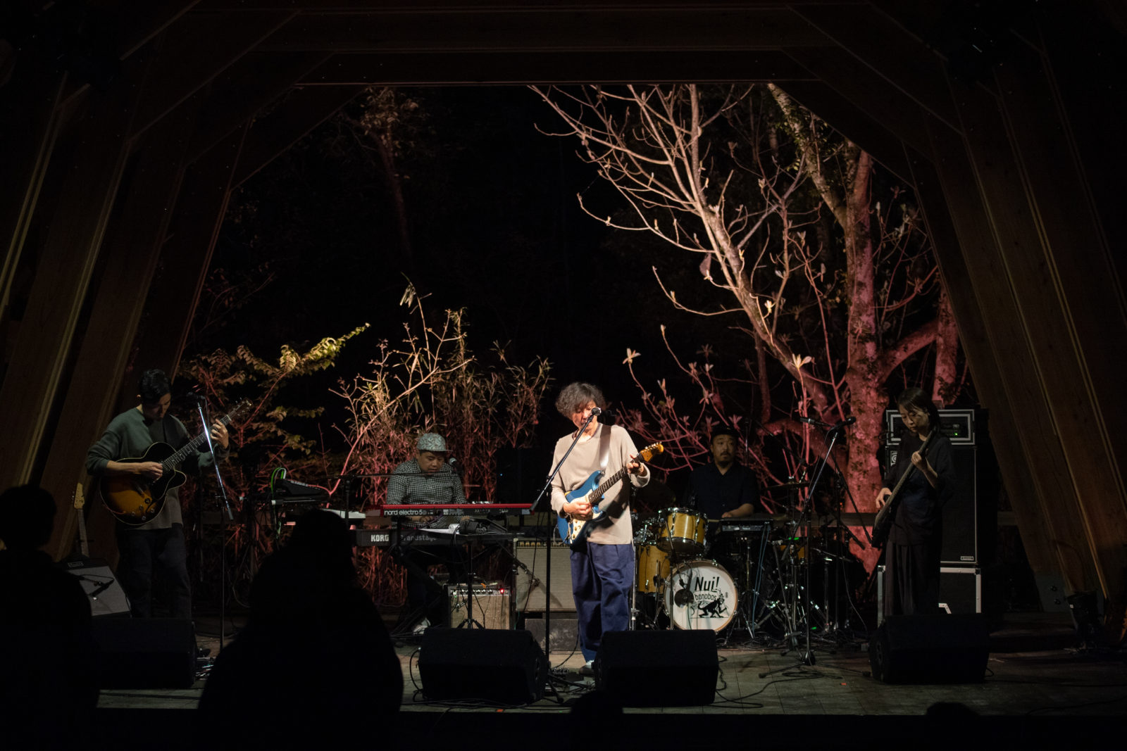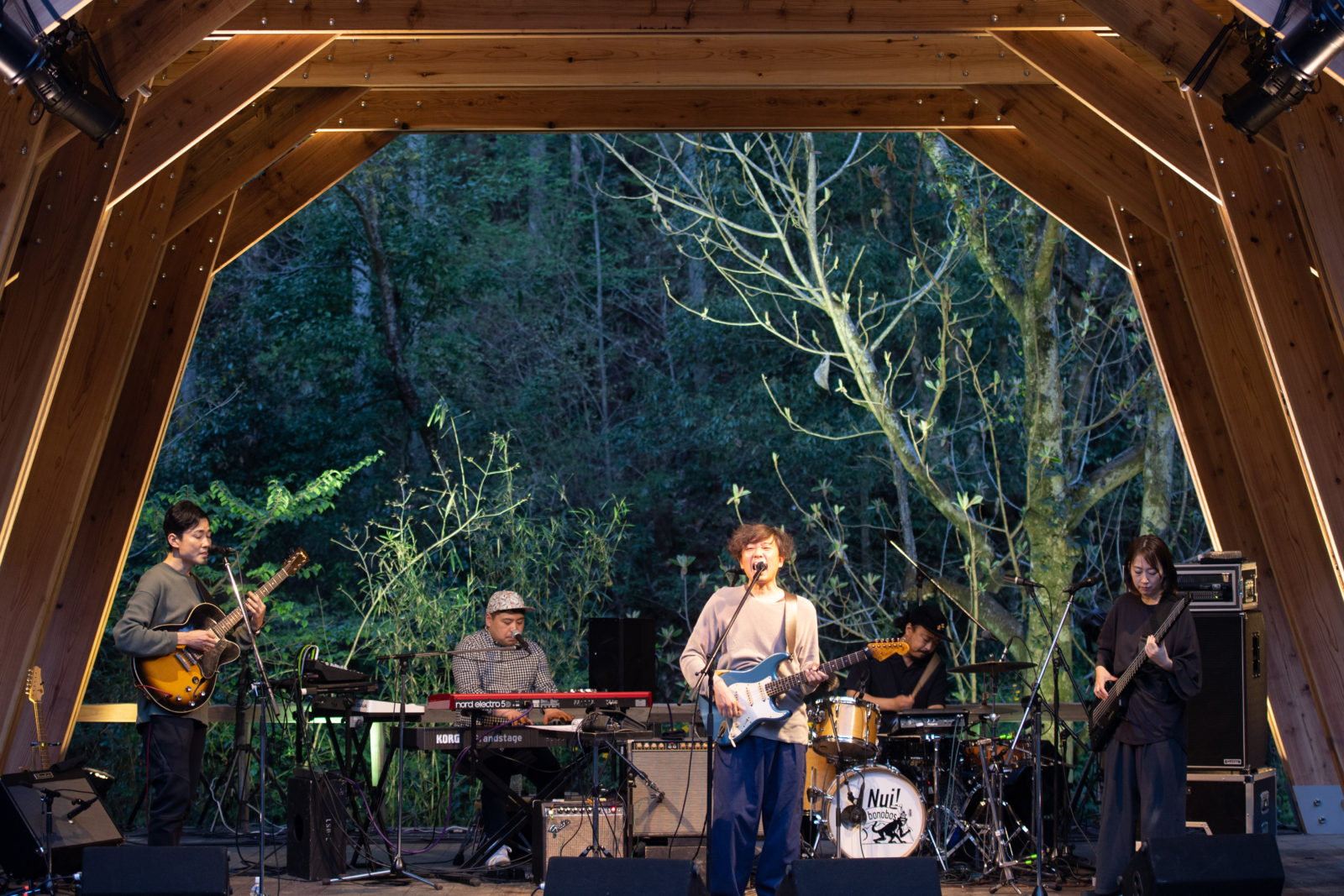 bonobosがサウンドチェックに入る頃には会場は完全に夕闇に包まれ、ステージのライトアップも幻想的な時間帯。先日解散を発表したばかりの5人のステージ上でのやりとりはなんとも仲睦まじく、あっけらかんとしているようで、どこか適度な距離があるようで。各パートのチェックが終わり、4カウントから5人での演奏が始まると、まだチェックなのにも関わらず会場では大きな歓声が上がりました。約20年もの間バンドとして時間を共にしてきた彼らにしか出せないグルーヴが会場全体に渦巻いていきます。