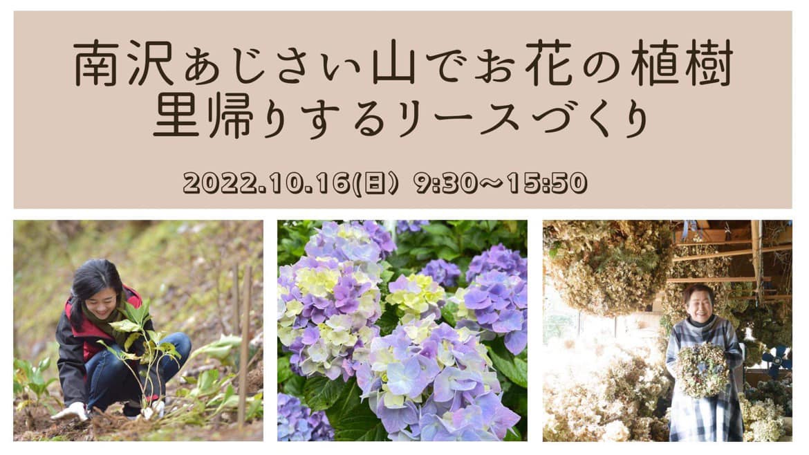 約50年かけて15,000株以上のあじさいの花を咲かせた「花咲かじいさん」南澤忠一さんと、長女の和江さん、あじさいを受け継ぐ若者と一緒に、持続可能な里山づくりを行う体験ツアーです。10月16日には、あじさいの植樹のほか、花桃やミツマタなどの挿し木を行います。ランチでは珍しいあじさい茶が振る舞われます。午後はあじさい山の自然素材でつくるあじさいの「里帰りするリース」を作成。つくったリースはお持ち帰り可能です。ツアーの実施は、東京山間地域で体験ツアーを提供する東京マウンテンツアーズ。
