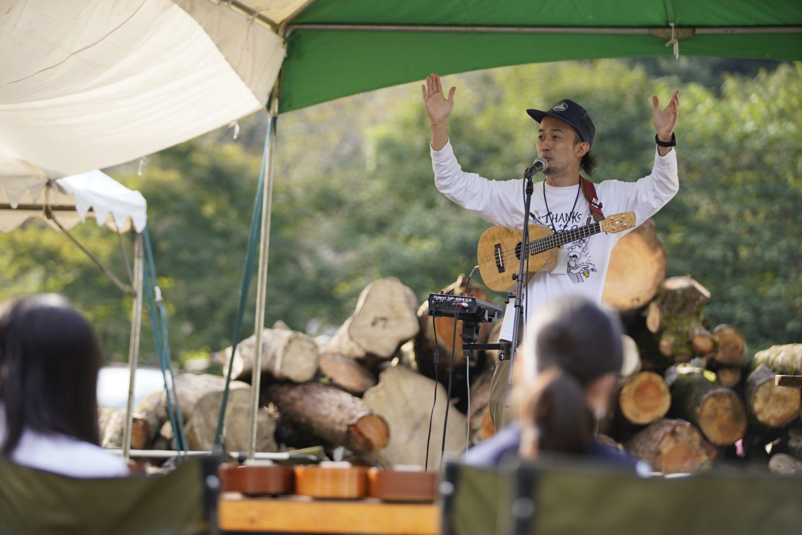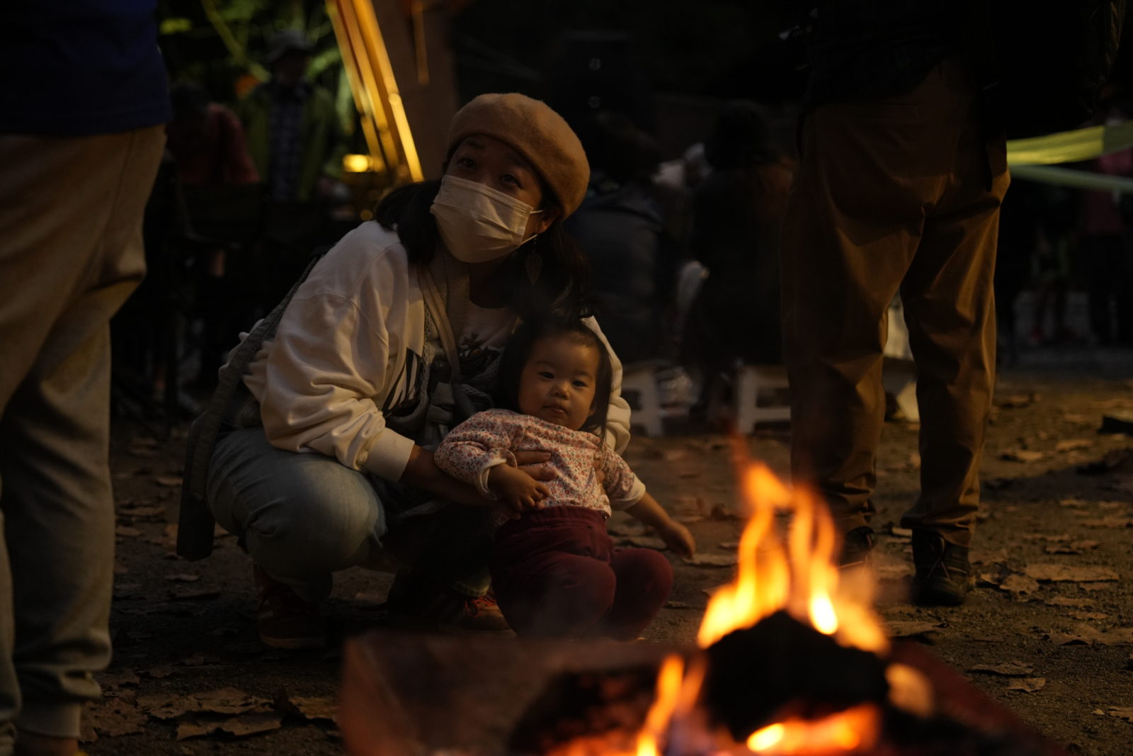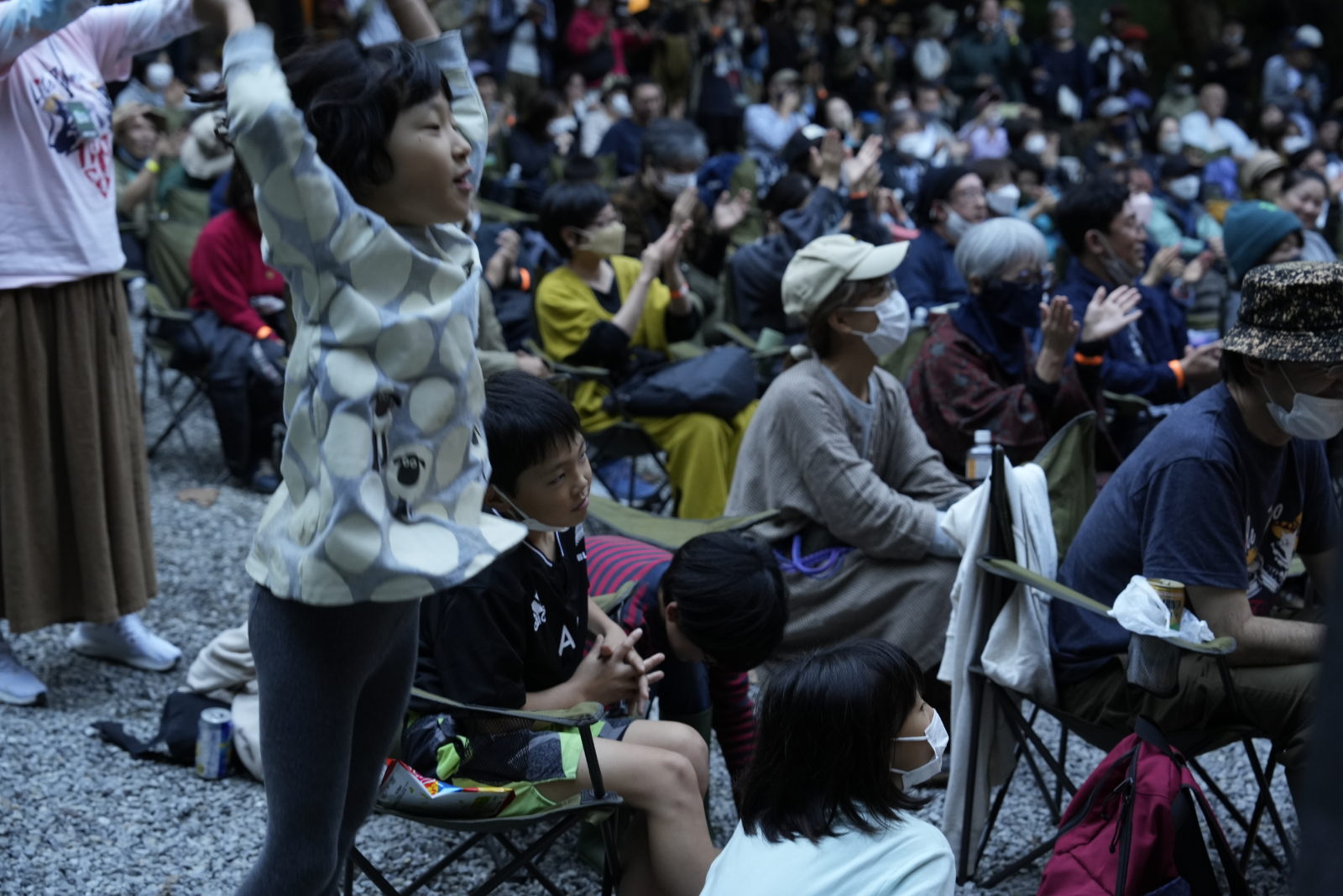 今日1日をめいいっぱい遊び尽くした皆さん。大人も子ども皆焚き火を眺めながら、ステージを見つめながら、和やかに会話をしながら二人の演奏を噛み締めているのが印象的でした。ワークショップもいよいよ終盤、「うさぎ追しかの山」そんなYaeの歌声が秋川のふるさとにのエンディングを知らせます。
