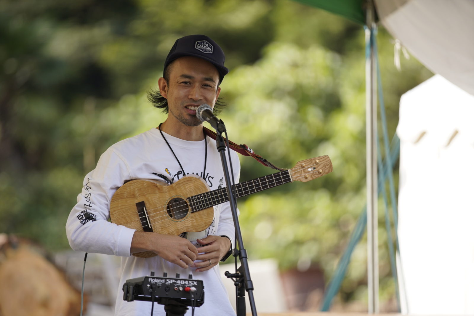 オープンを迎えた会場には続々とお客さんの列が連なり、宮武弘がサブステージに上がる途端に秋川の空は晴れ間を見せ始めました。ウクレレの甘い音色に引き寄せられるように、ステージ前に集まり始めるお客さんたち。「外遊びって最高だよね!」そんな言葉と共に始まった演奏。宮武弘の呼びかけに両手を高くあげてコールアンドレスポンスを楽しむ子どもたちやお父さんお母さんの笑顔がありました。