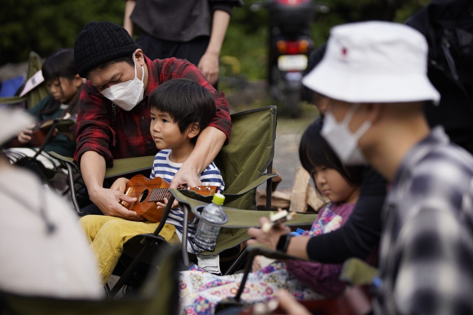 焚き火や美味しそうなご飯の匂いと共に一気に温まった会場では、ウクレレのワークショップが始まります。宮武弘を囲むように参加者の皆さんが集い、大人から子どもまでポロポロとウクレレをつまびきながら和やかなひと時を過ごしていました。
