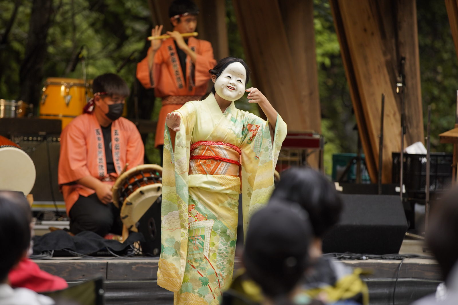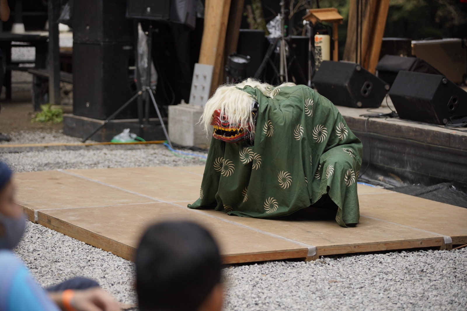 吉井盛悟の合図で横笛と締め太鼓の音色が響き、獅子舞などの緩急豊かで躍動的な舞が始まります。伝統芸能の第一線で活躍する吉井盛悟に見守られながら演奏をする五日市中学伝統芸能部の皆さん。地域の文化を絶やさぬようにと活動を続ける彼らの姿勢に、オーディエンスの皆さんも真剣な眼差しを向けていました。