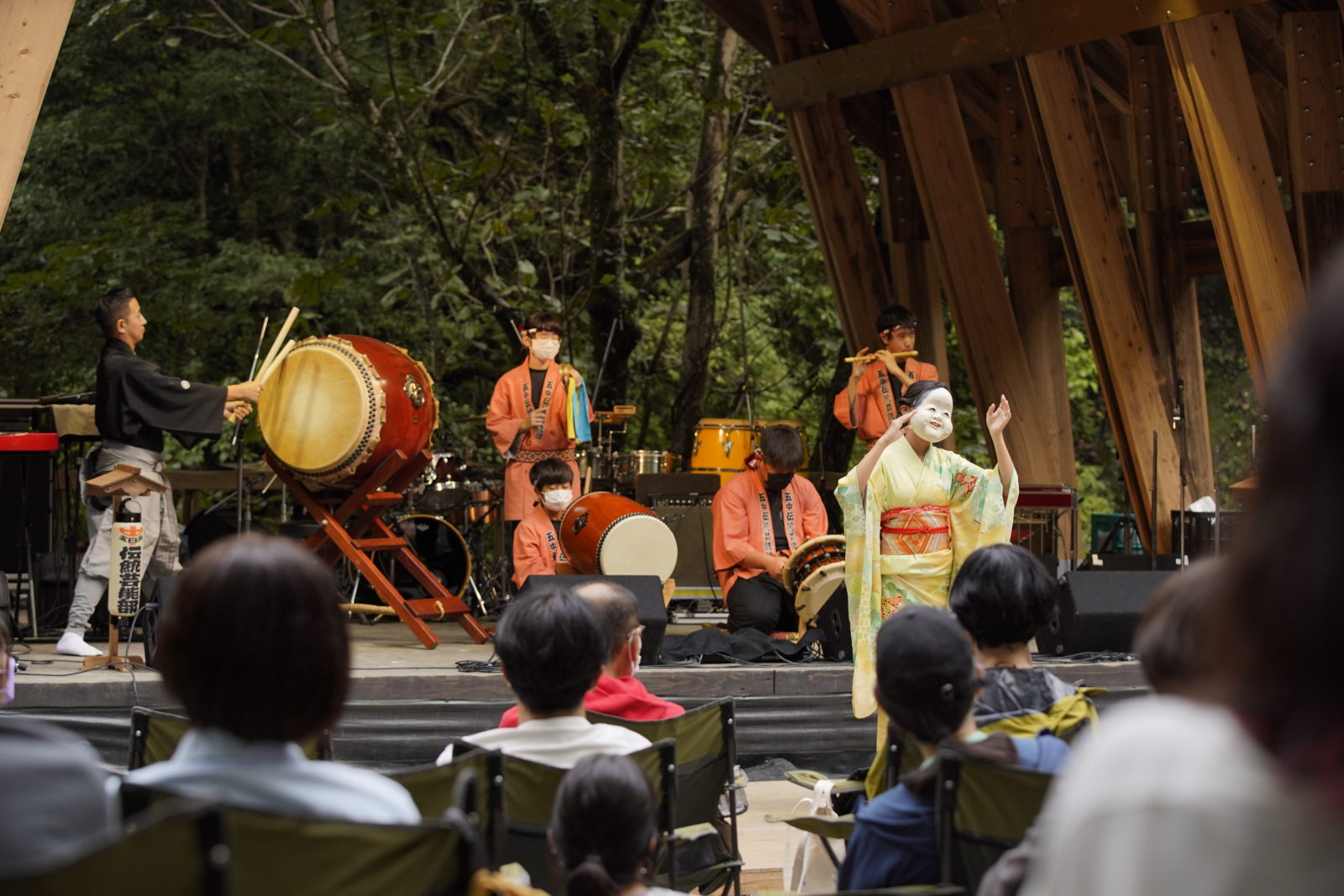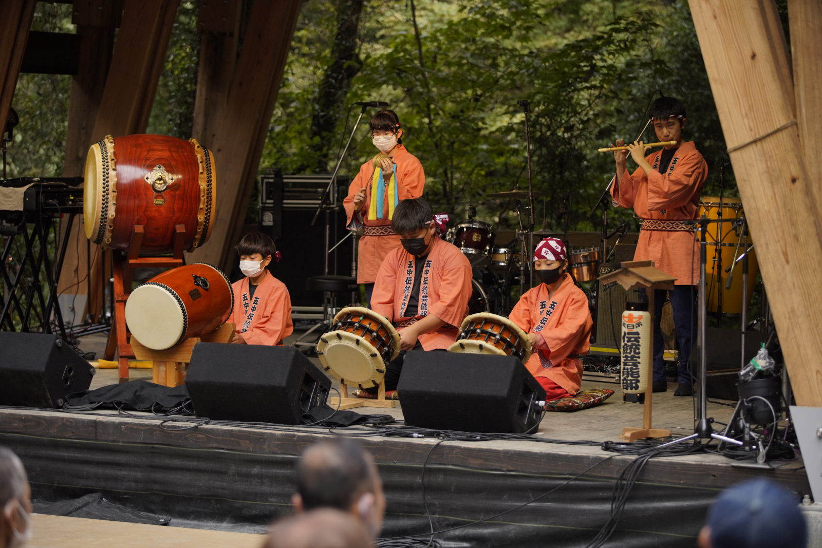 少しずつ葉の色を変える秋川渓谷の森を背に、大小様々な太鼓が並ぶメインステージ。MCさとうこむぎとアースガーデン代表の南兵衛の呼び込みで五日市中学伝統芸能部 with 吉井盛悟が上がると、静寂に包まれる会場にゆっくりと太鼓の音がこだましていきます。