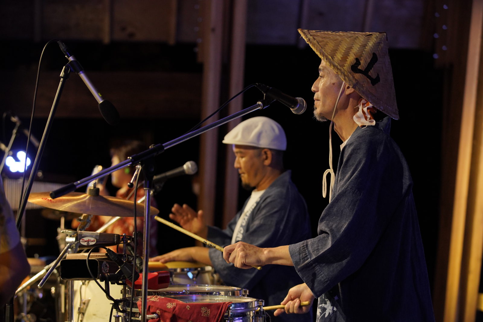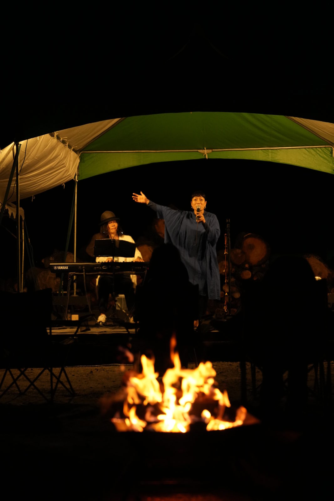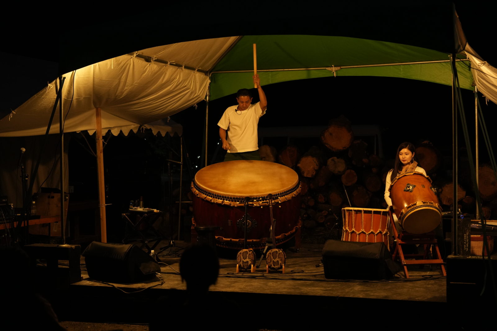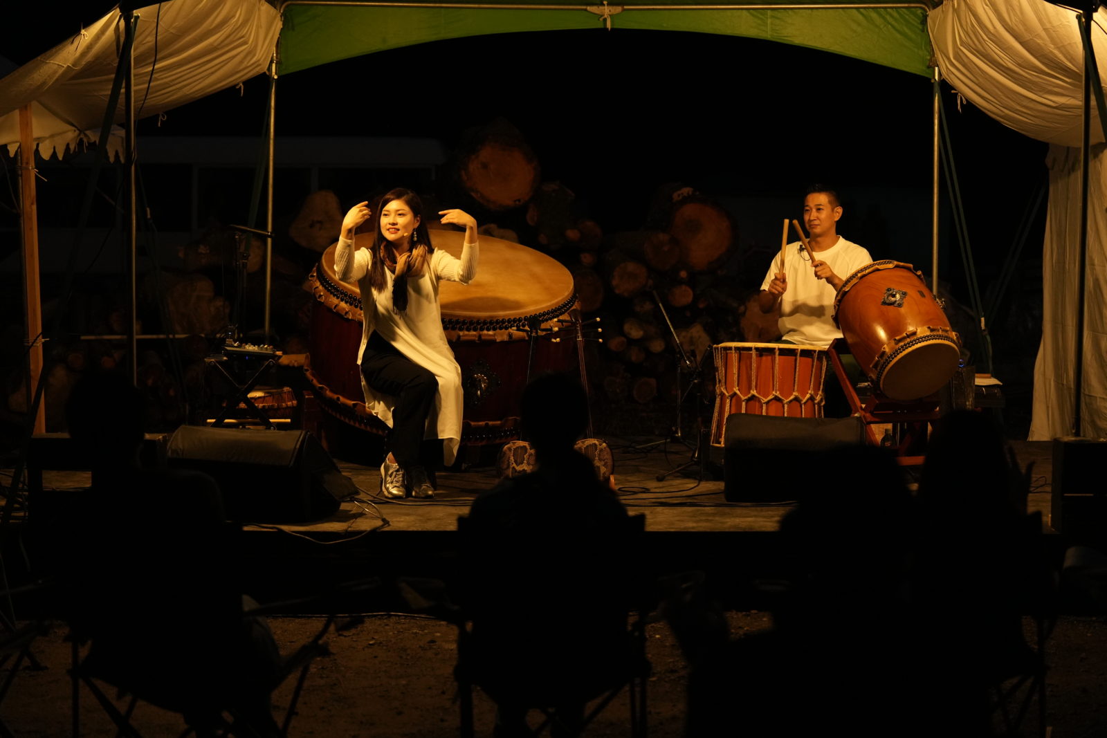 ワークショップに美味しいご飯やお酒を楽しむ皆さんもステージを見つめ、二人の演奏に耳を傾けていました。後半に向けて祭りの音色はどんどんとヒートアップ。焚き火のあかりに照らされながら体を揺らす皆さんと呼応するように、二人の見事な掛け合いをも熱がこもっていきました。