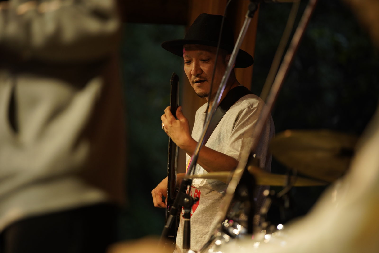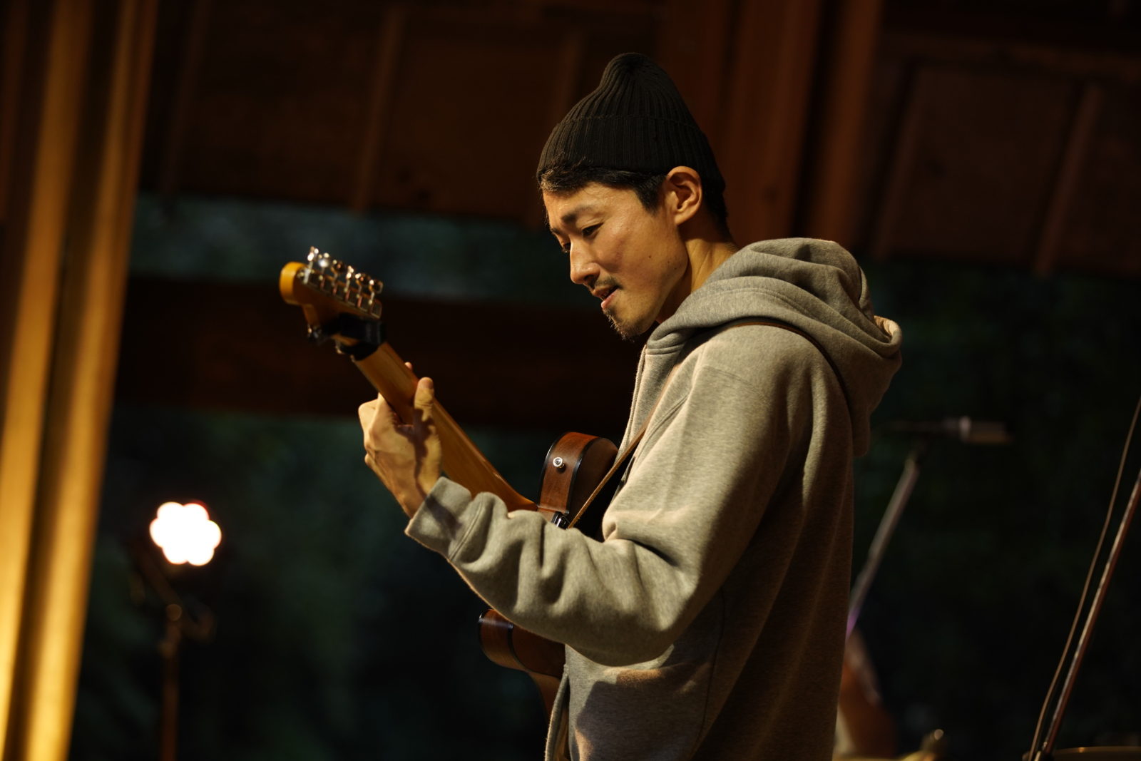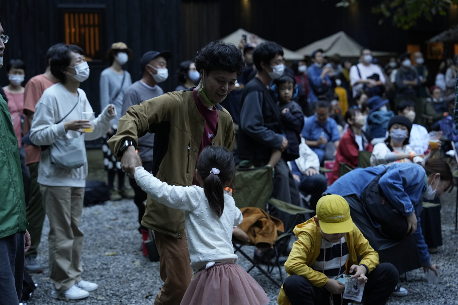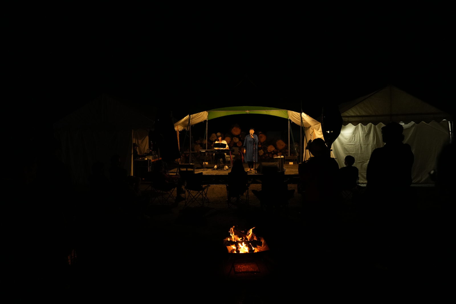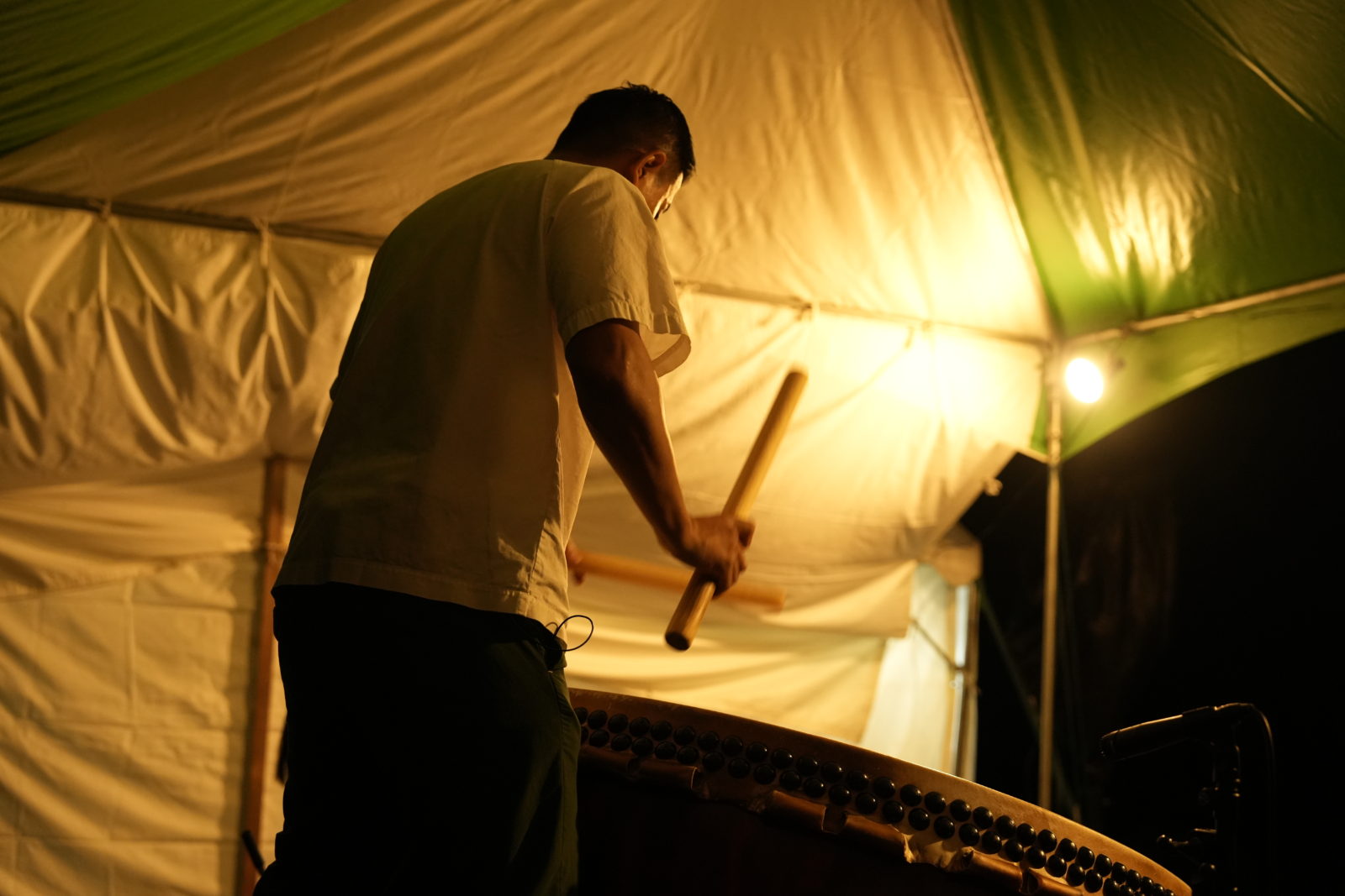 ワークショップに美味しいご飯やお酒を楽しむ皆さんもステージを見つめ、二人の演奏に耳を傾けていました。後半に向けて祭りの音色はどんどんとヒートアップ。焚き火のあかりに照らされながら体を揺らす皆さんと呼応するように、二人の見事な掛け合いをも熱がこもっていきました。