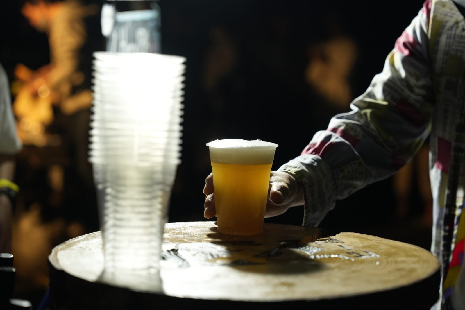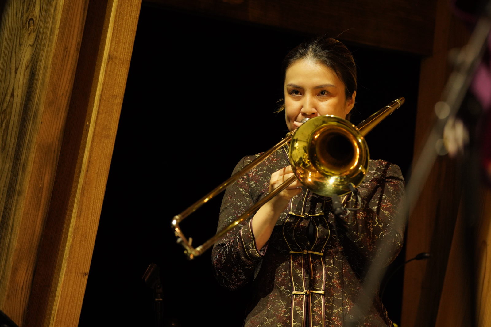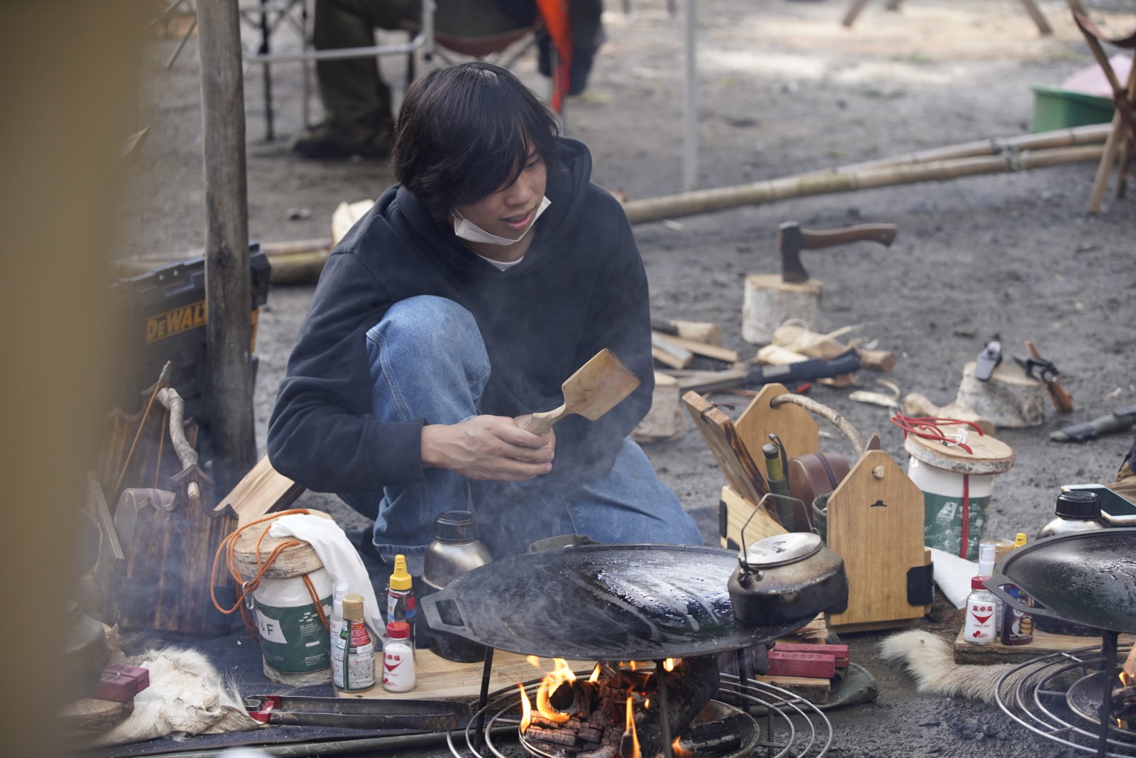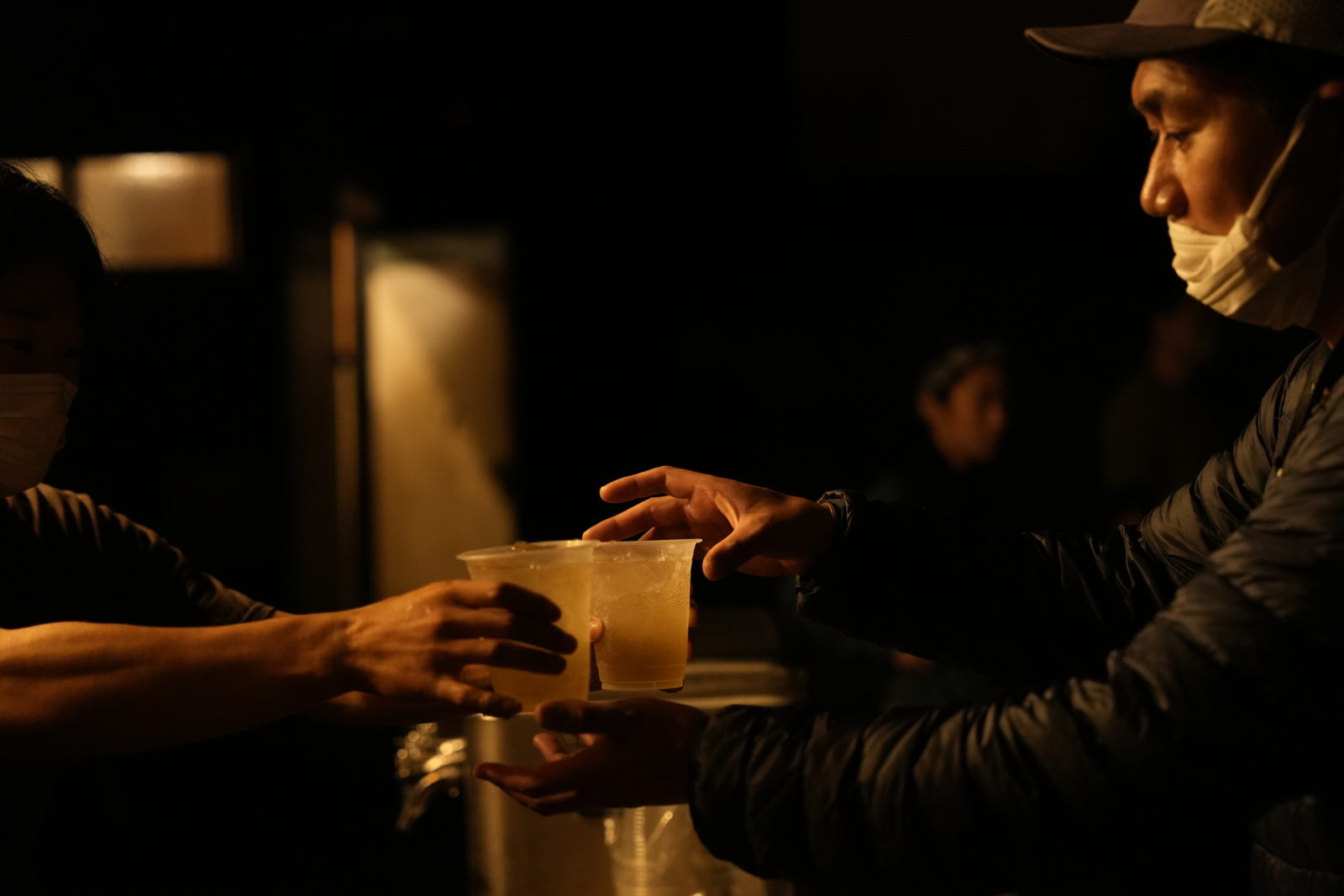 ワークショップに美味しいご飯やお酒を楽しむ皆さんもステージを見つめ、二人の演奏に耳を傾けていました。後半に向けて祭りの音色はどんどんとヒートアップ。焚き火のあかりに照らされながら体を揺らす皆さんと呼応するように、二人の見事な掛け合いをも熱がこもっていきました。
