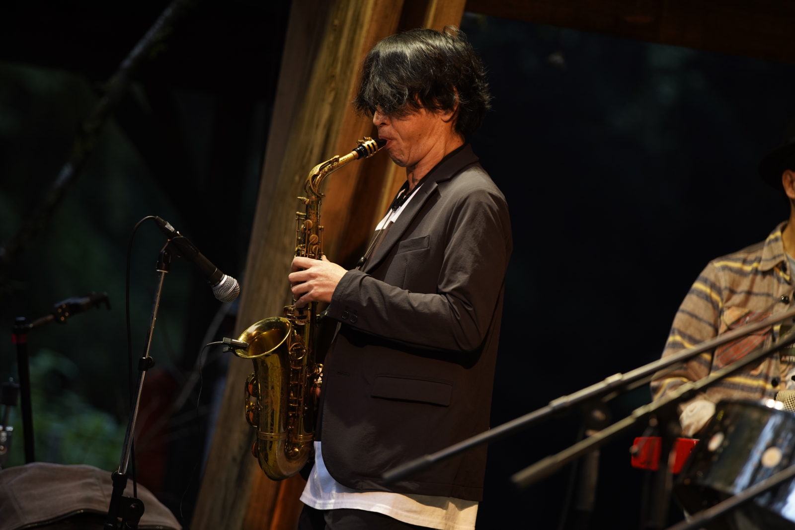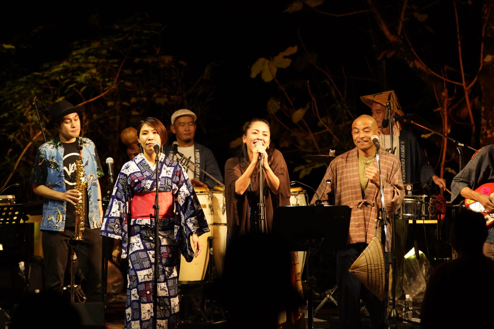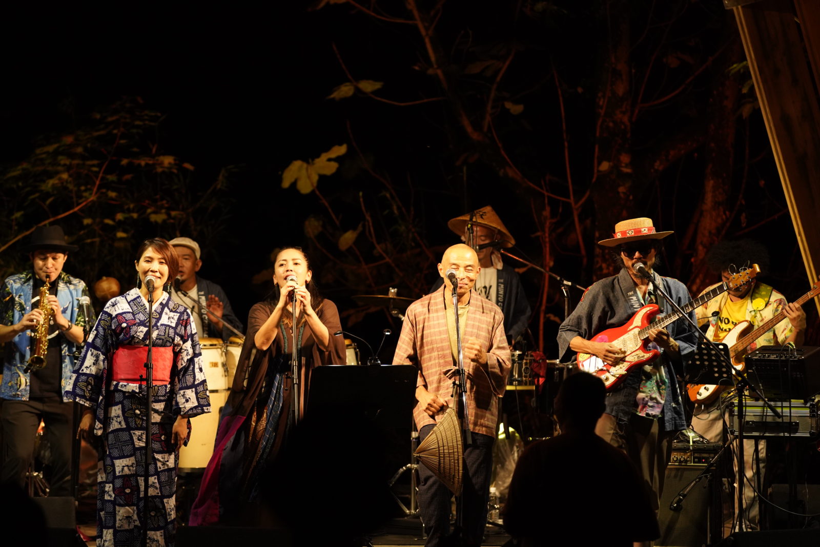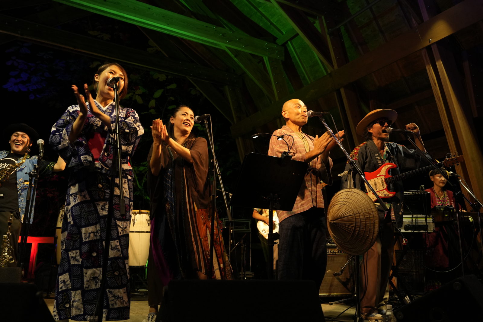 「森と踊ってますか!?」そんな掛け声に今日一番の大きな歓声をあげるオーディエンス。泥臭いリズム隊に重なるファンキーな管楽器やギター、その上を軽やかなこぶしの日本民謡が転がり、独特のグルーヴが夜の森に渦巻きます。