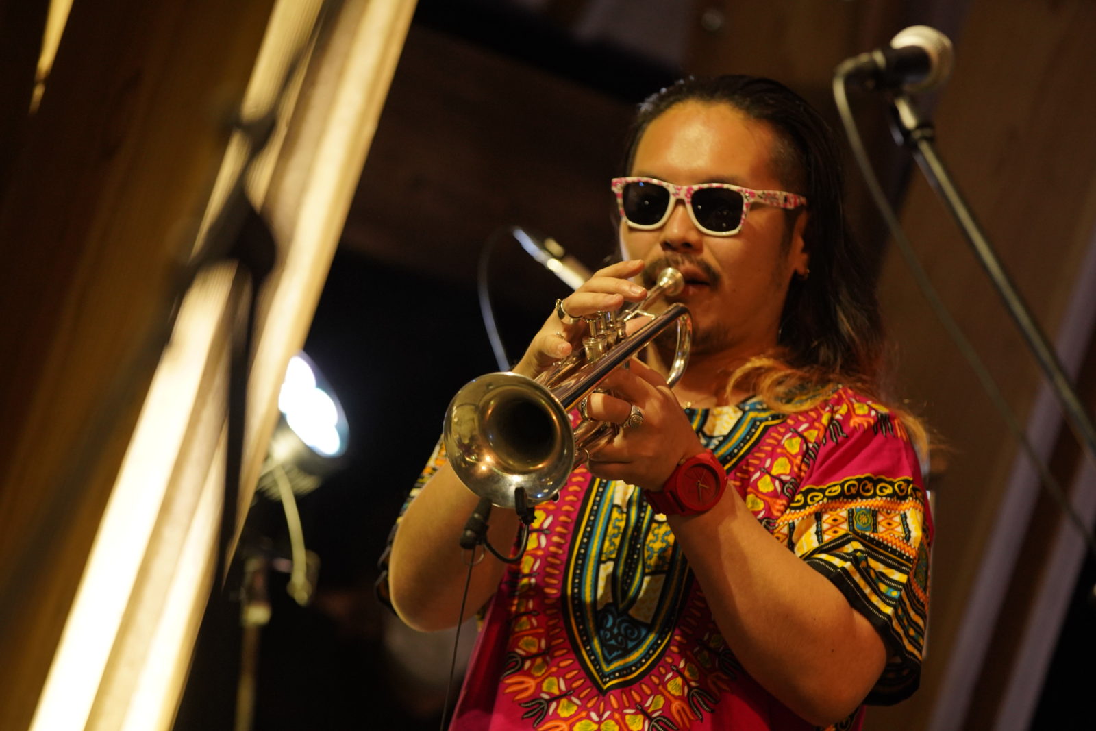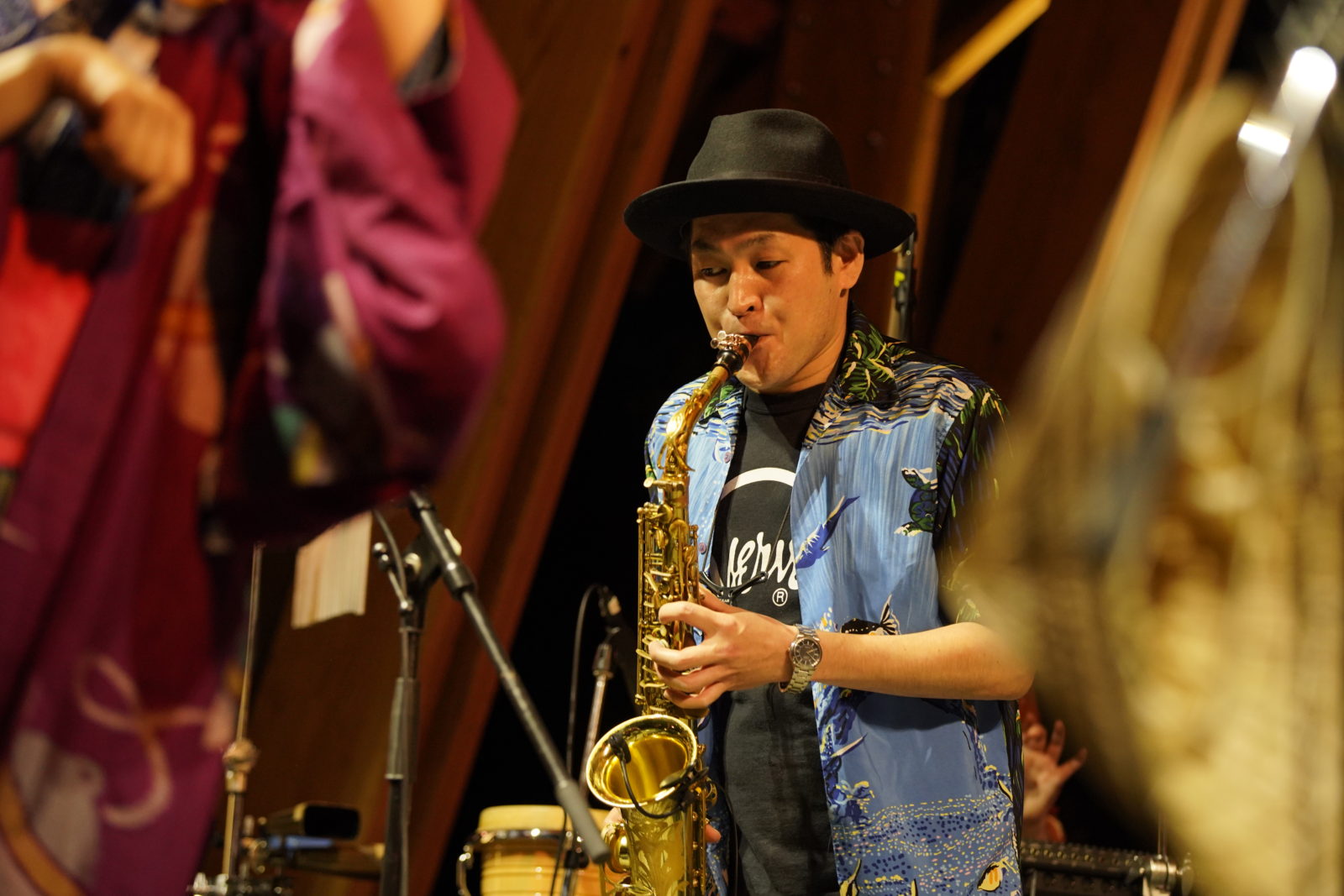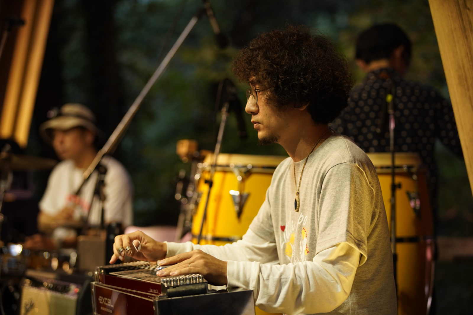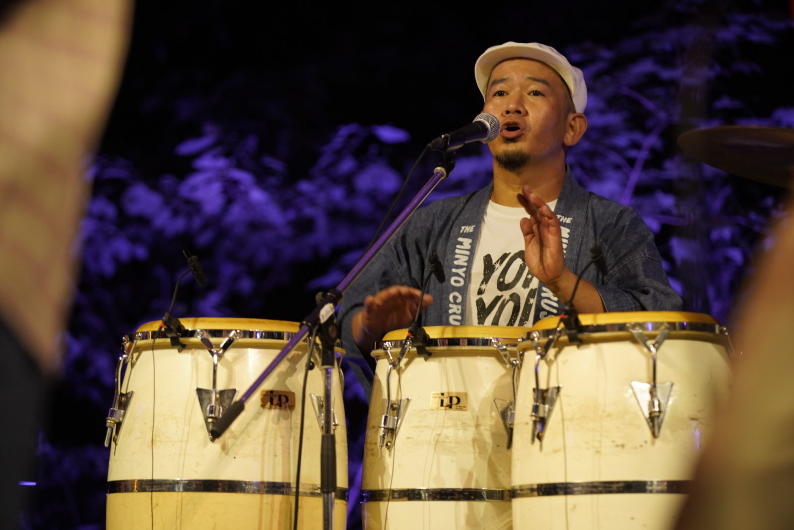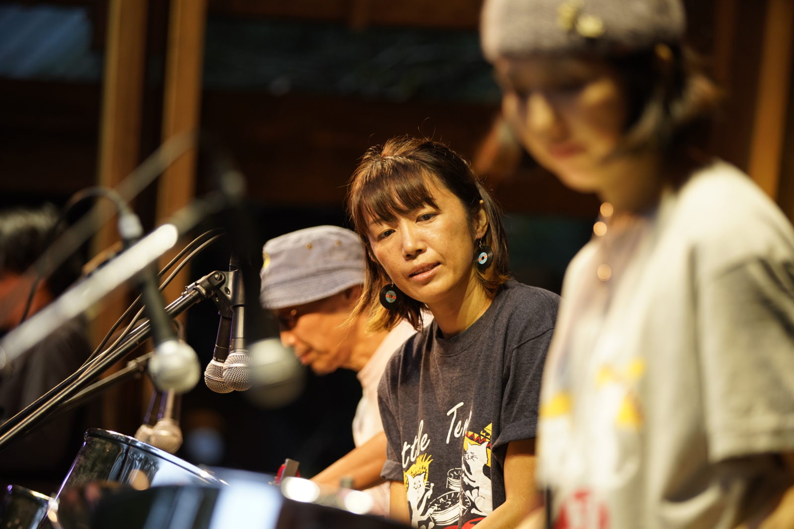 「森と踊ってますか!?」そんな掛け声に今日一番の大きな歓声をあげるオーディエンス。泥臭いリズム隊に重なるファンキーな管楽器やギター、その上を軽やかなこぶしの日本民謡が転がり、独特のグルーヴが夜の森に渦巻きます。