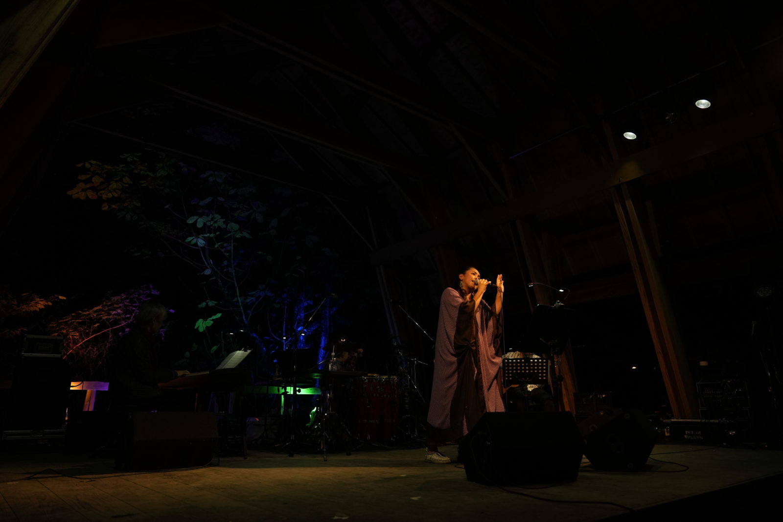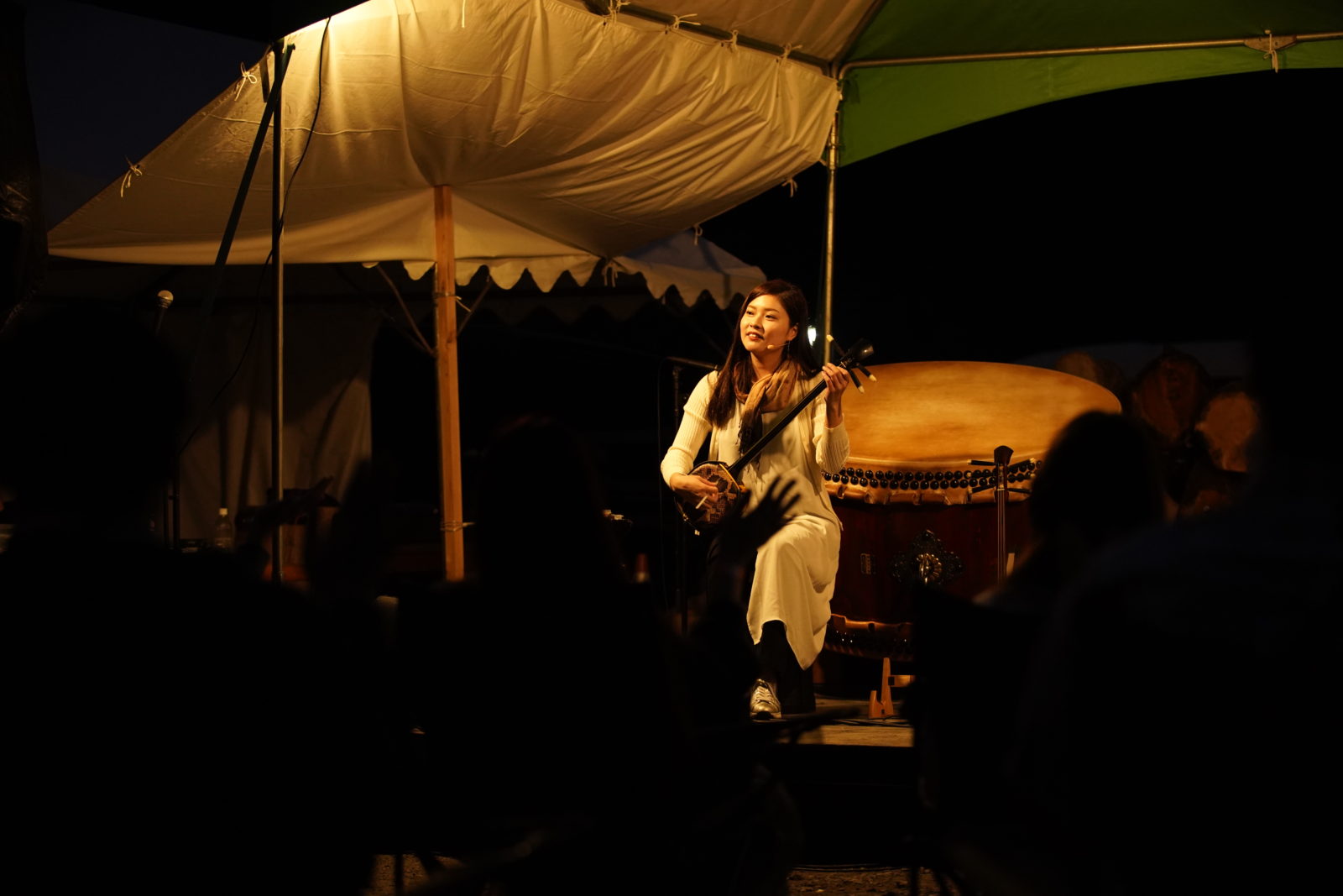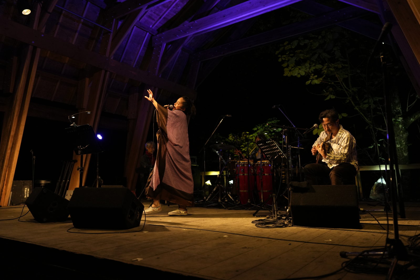平田まりな with 吉井盛悟がステージに上がる頃にはもう当たりは宵闇。太鼓の音に弦楽器の賑やかな音色が重なり、平田まりなの歌声が秋川渓谷の住んだ夜の空気の中に溶けこんでいきます。