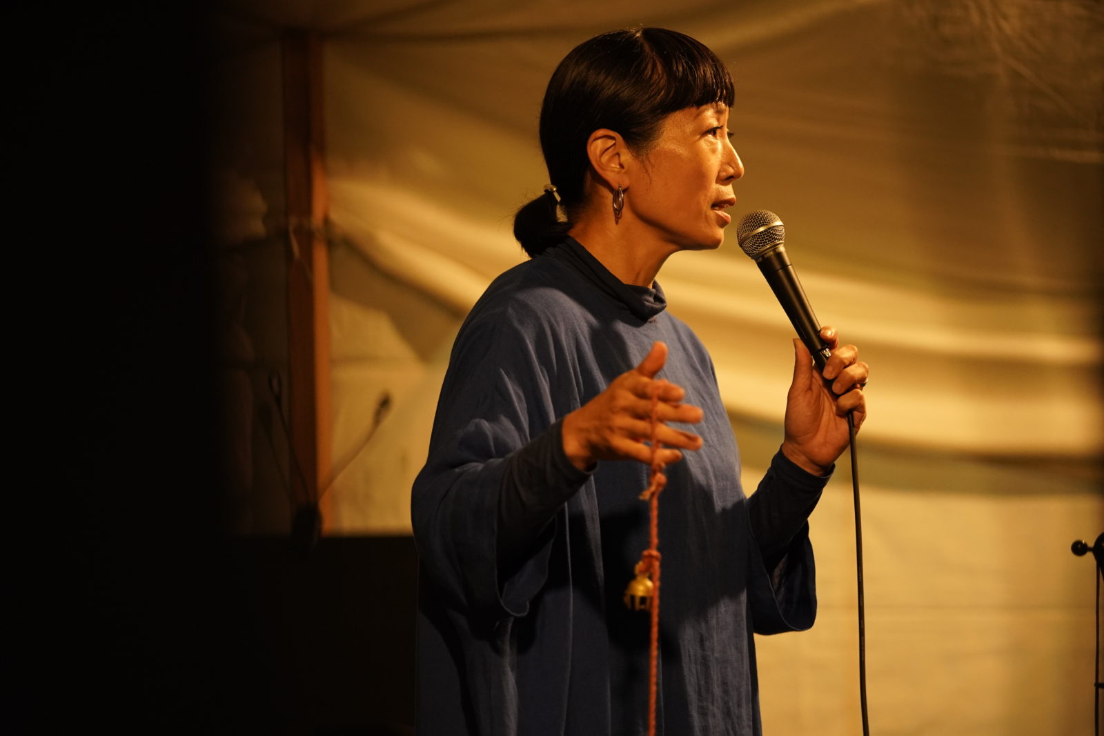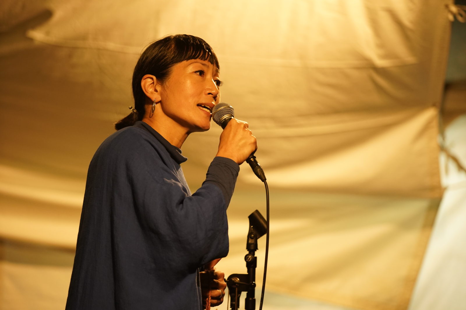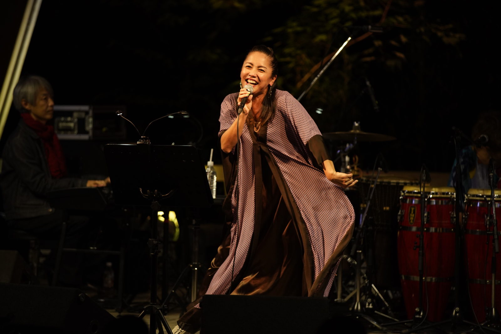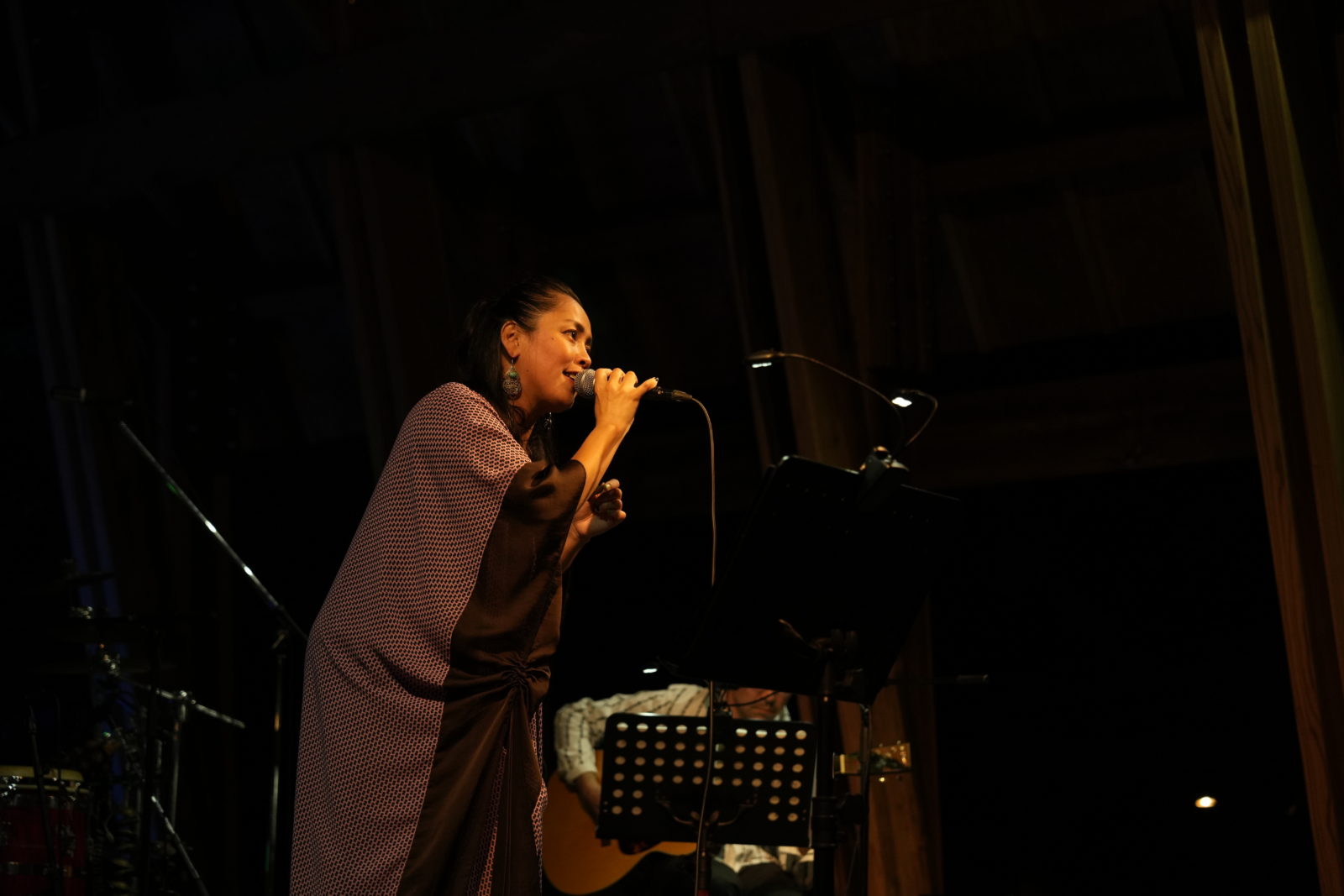 平田まりな with 吉井盛悟がステージに上がる頃にはもう当たりは宵闇。太鼓の音に弦楽器の賑やかな音色が重なり、平田まりなの歌声が秋川渓谷の住んだ夜の空気の中に溶けこんでいきます。