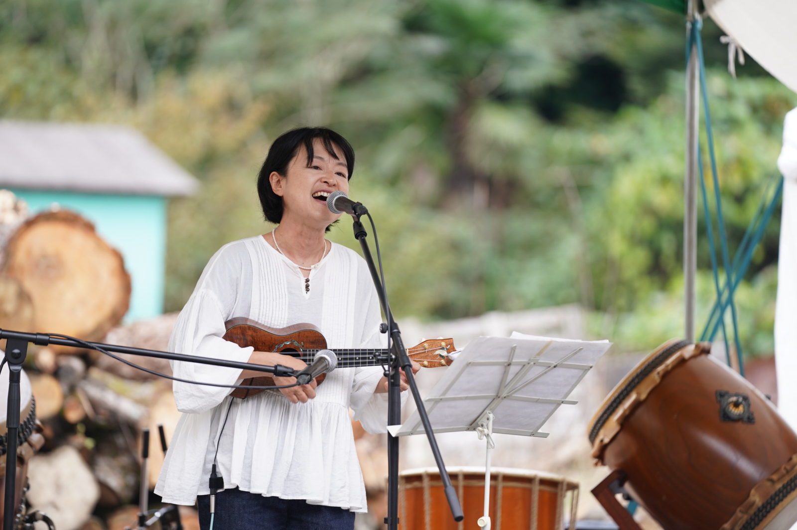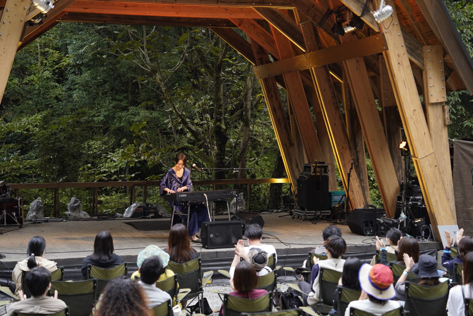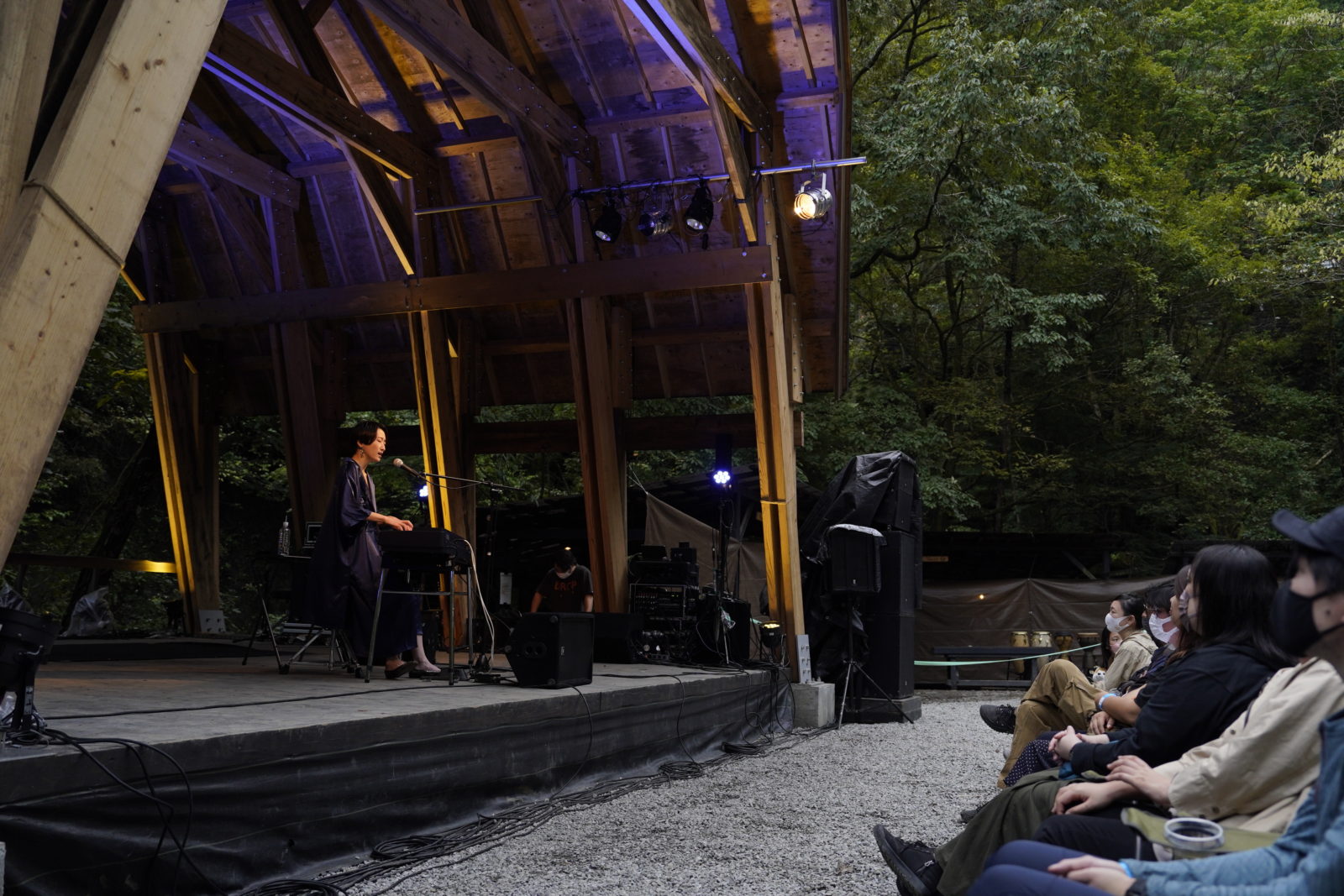 少し肌寒くなってきた会場には、焚き火のはぜる音やワークショップを楽しむみなさんの声、様々な音が彼女の演奏と仲睦まじく寄り添い合います。目を閉じて伸びやかに歌い上げるその姿を見つめるオーディエンス。フェスティバルならではの暖かい音色が秋の山に響き渡りました。