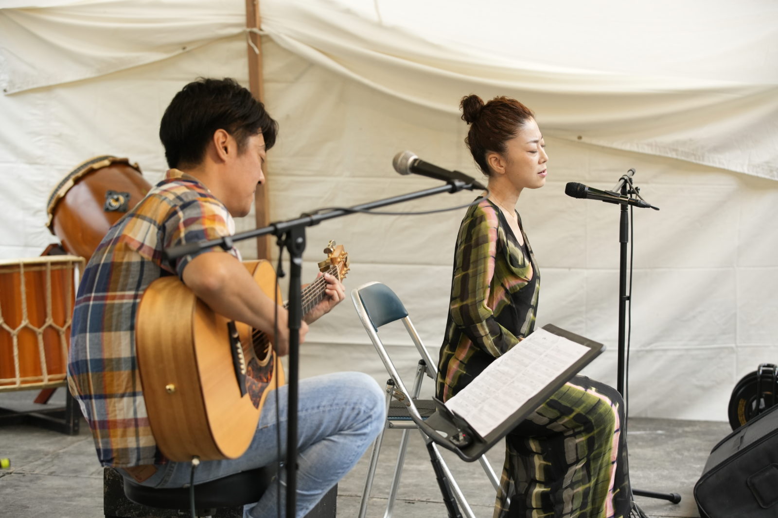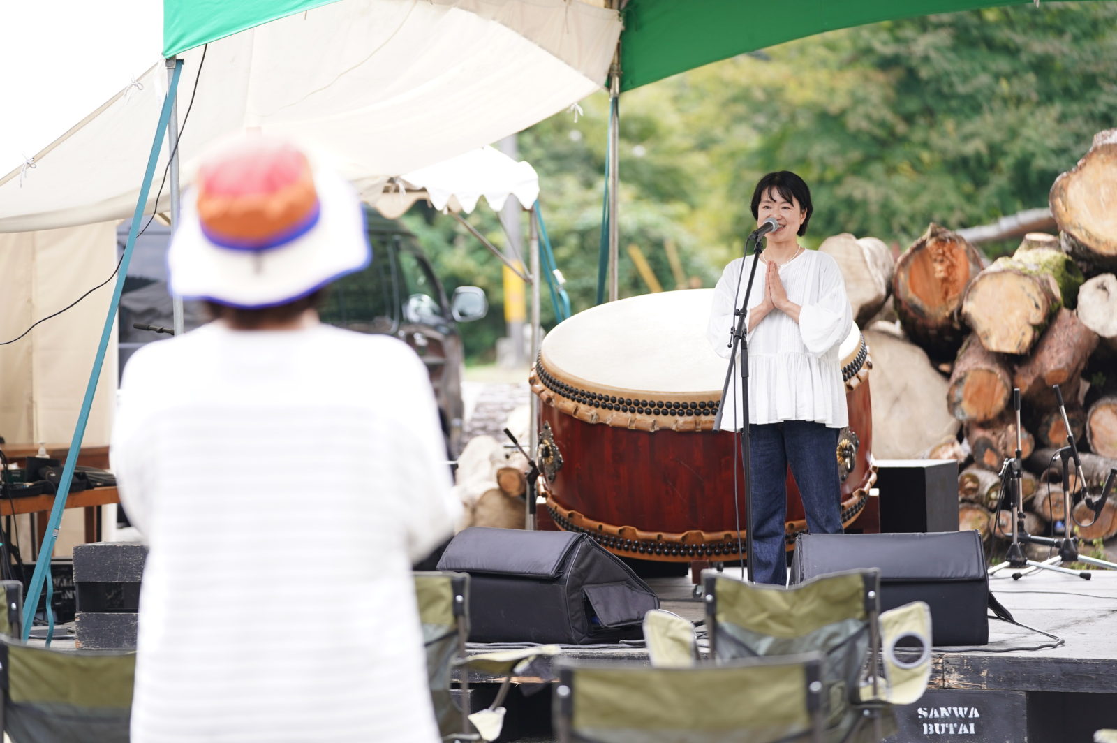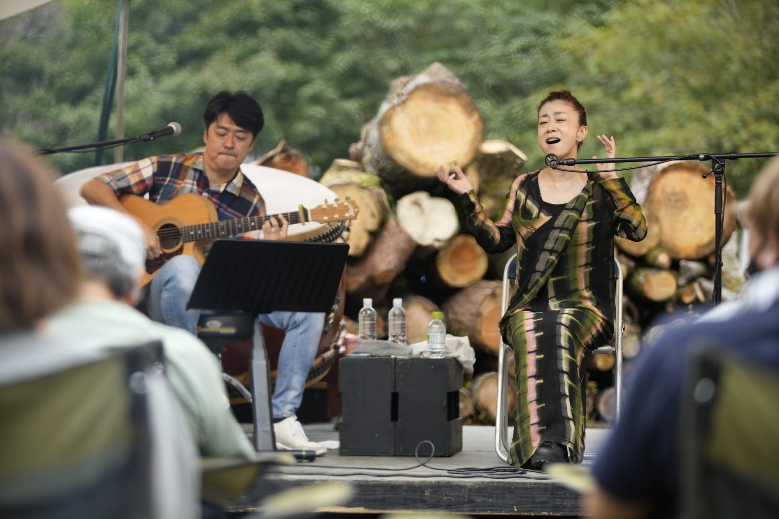 少し肌寒くなってきた会場には、焚き火のはぜる音やワークショップを楽しむみなさんの声、様々な音が彼女の演奏と仲睦まじく寄り添い合います。目を閉じて伸びやかに歌い上げるその姿を見つめるオーディエンス。フェスティバルならではの暖かい音色が秋の山に響き渡りました。