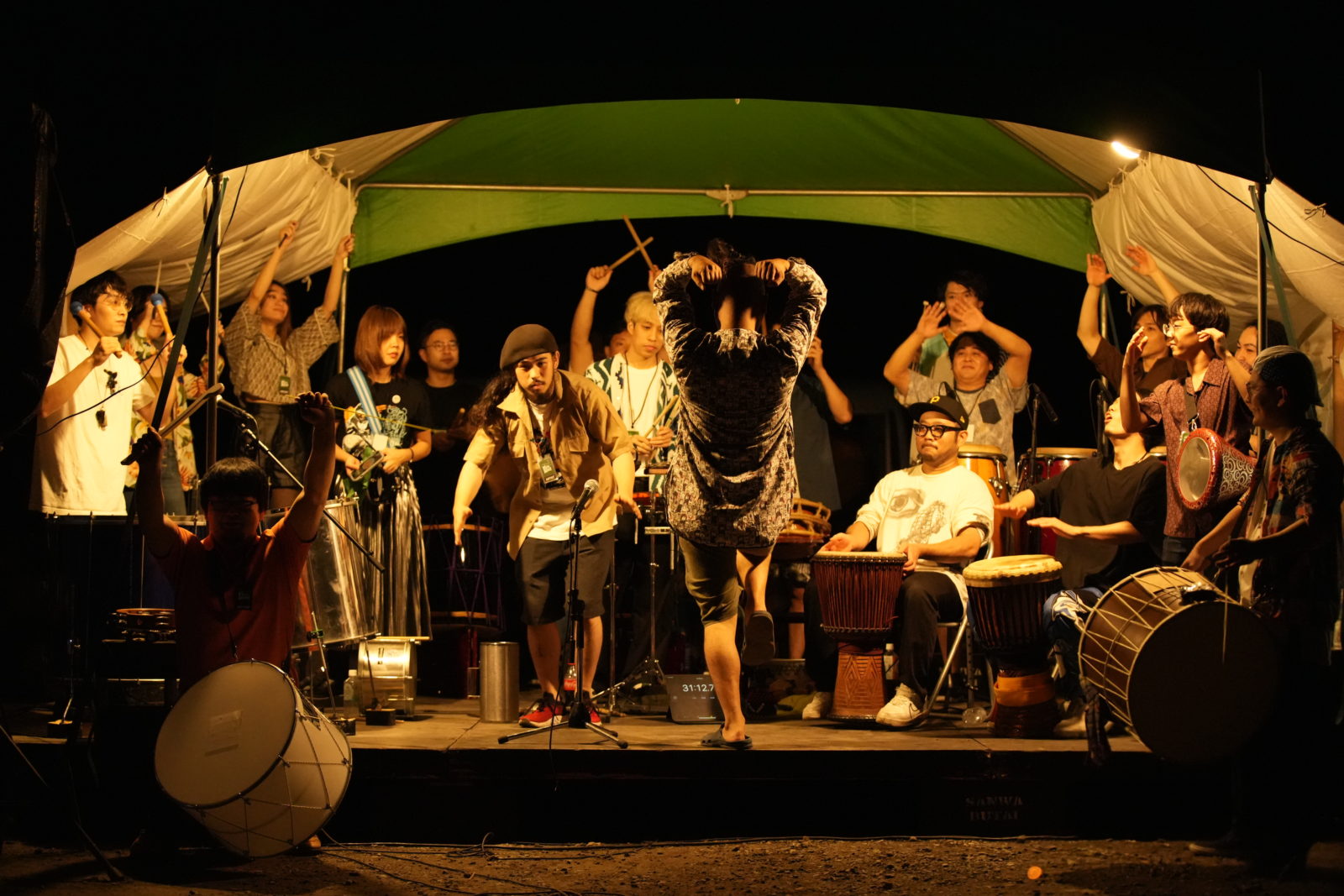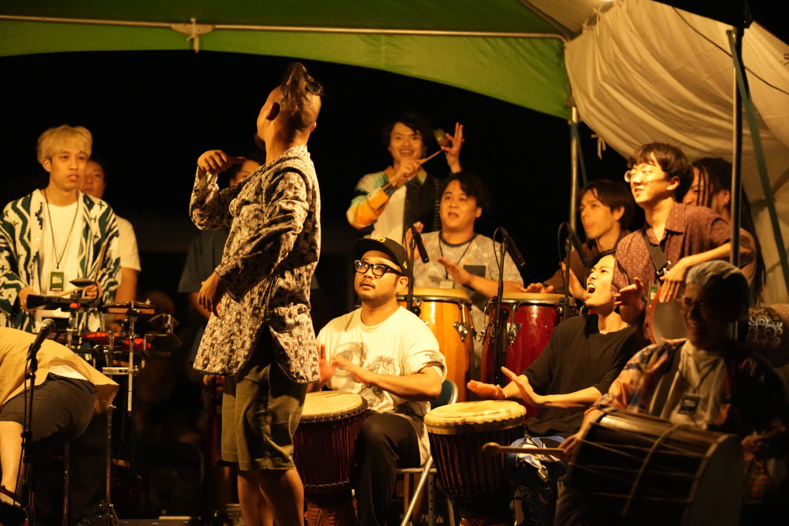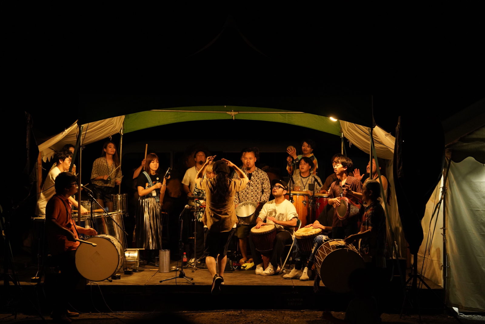 焚き火の炎に照らされたステージから轟く打音が、山々に囲まれた夜空にこだましていく祭りの終盤。さらに加速していく演奏はいよいよクライマックスを迎え、トーキョーマウンテンのサブステージは幕を下ろしました。