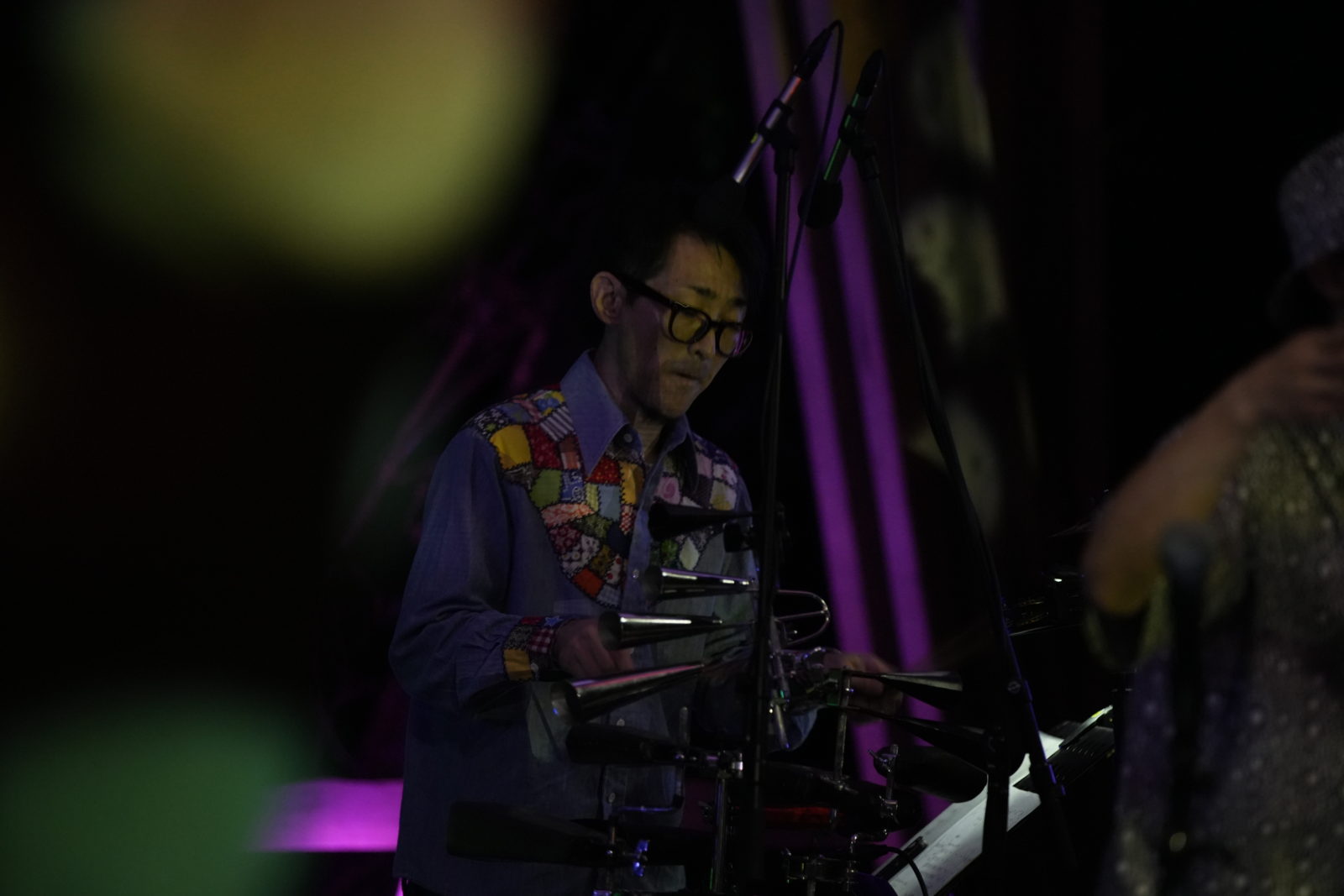 演奏がヒートアップしてくるに連れVJ mitchelによる映像世界も加速していきます。殆どMCを挟まず、間髪入れずに楽曲を展開していくGOMA & The Jungle Rhythm Section with VJ mitchel。BBQやお酒を楽しみながら、生き物のように色彩を変えるステージにカメラを向けながらこのひと時を遊ぶ皆さんの笑顔が会場に溢れました。