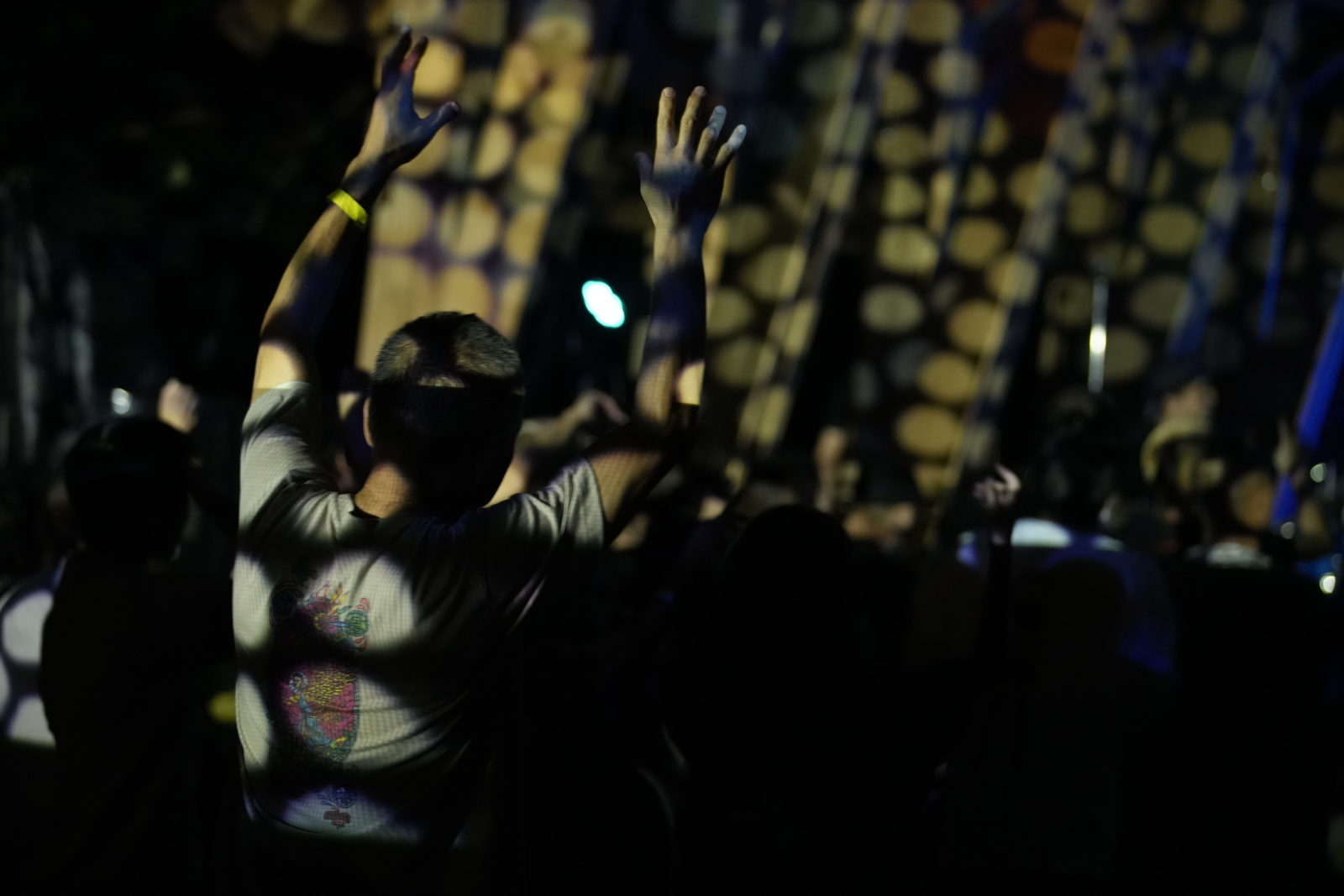 暗闇に包まれるメインステージにGOMAディジュリドゥの音が響き、The Jungle Rhythm SectionのパーカッションとVJ mitchelの幻想的な映像が一気に壁となって押し寄せます。凄まじいリズムの絡み合いに合わせてうねるディジュリドゥの音色。ステージ前にはオーディエンスが集まり、両手を大きく広げて身体を揺らしていました。