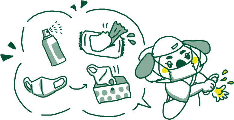 携帯用消毒液、マスク、除菌シート、マスクケースなどをお持ちください。
