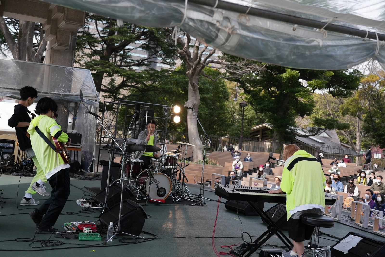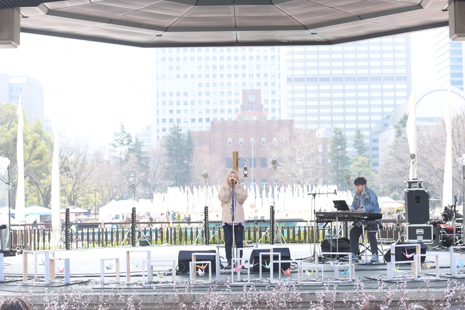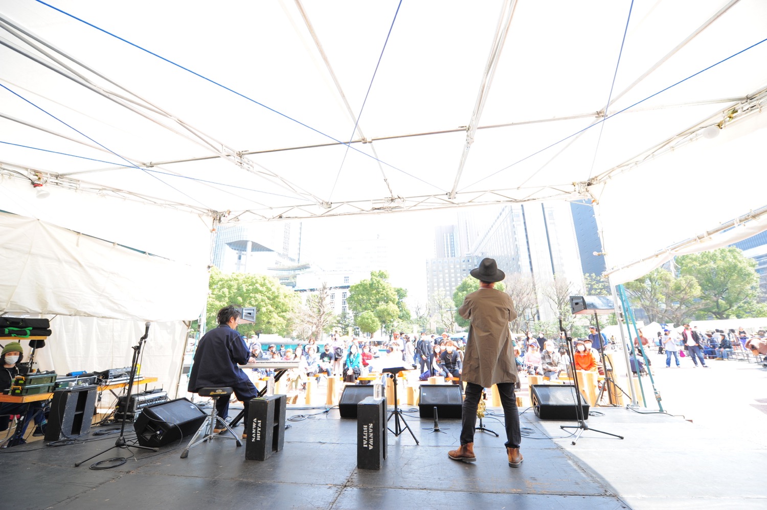 日曜日お昼の日比谷公園をまったりと楽しむ人々で賑わう中、管楽器と鍵盤の音が噴水広場に響きます。この時間、この場所で聴く庸蔵 × 木村イオリの演奏はまさにベストアクト!ゆったりと身体を揺らしながら彼らの軽快な音に会場は笑顔に満ちていきます。